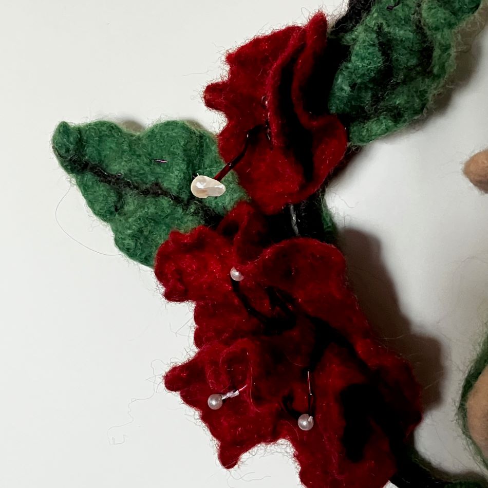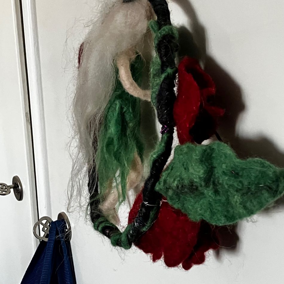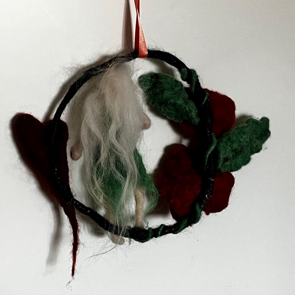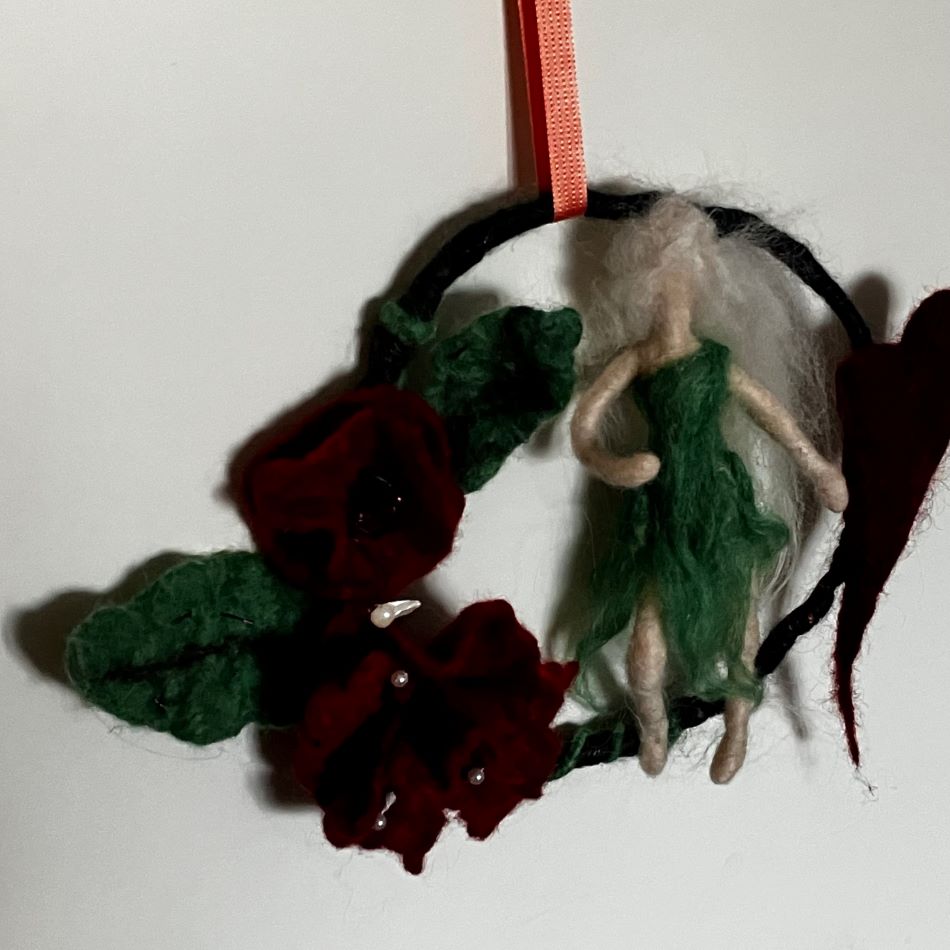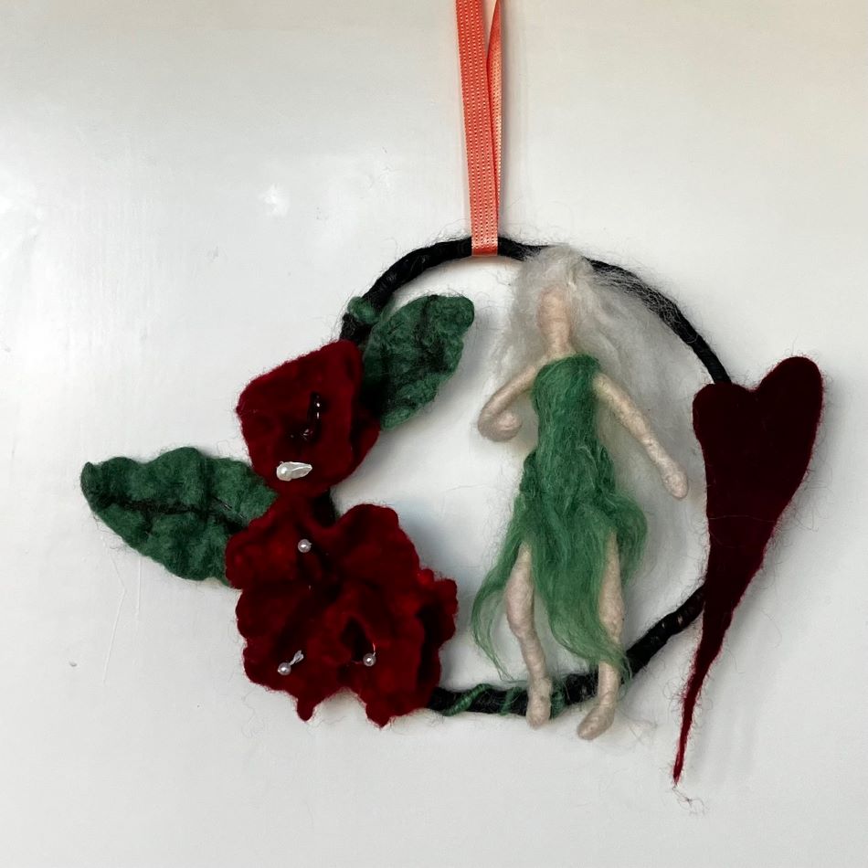 Blommorna är våttovade av finaste röd merinoull och lite pärlor . Även bladen som är i gröna nyanser är av merinoull. Kransen är även den dekorerad i merinoull på en stålvajer liksom den vackra älvan. Den går lätt att korrigera om du vill ha krans helt rund eller oval. Älvan kan man ändra lite position på armarna. Även hon är nålfiltad runt en stomme av stål.
