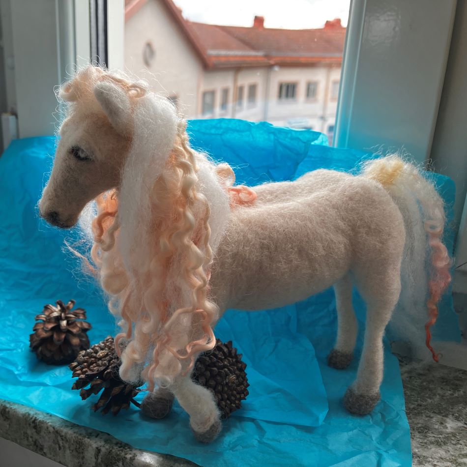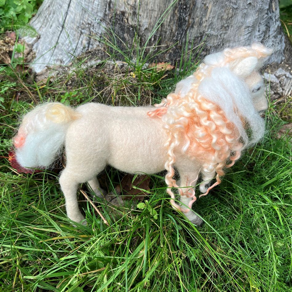 "Lysa" en sagohäst i ull. Nålfiltad och med den vackra färgen isabell. Stommen är i wire och uppbyggd i ull från gotlandsfår. Wiren/ståltråden gör att du kan ställa Lysa i olika positioner.