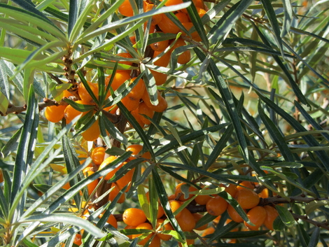 En orange havtorn. Mindre taggar. Stora bär. Medeltidig. Bra för självplock.