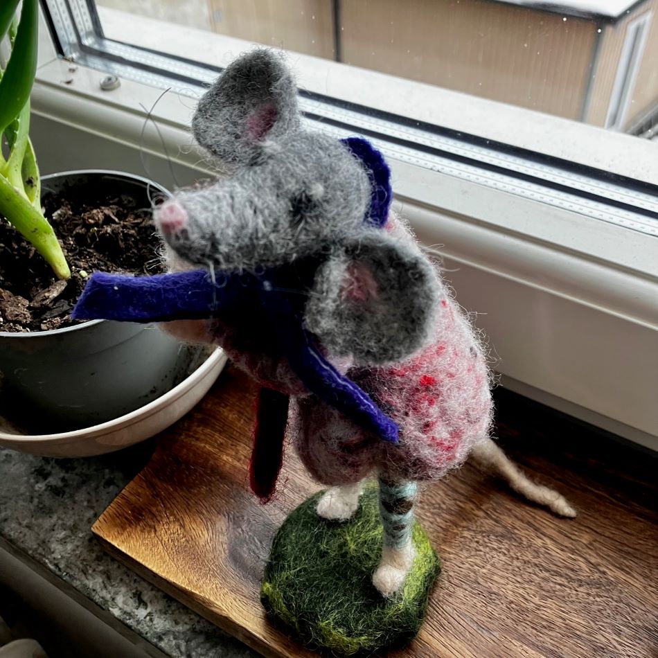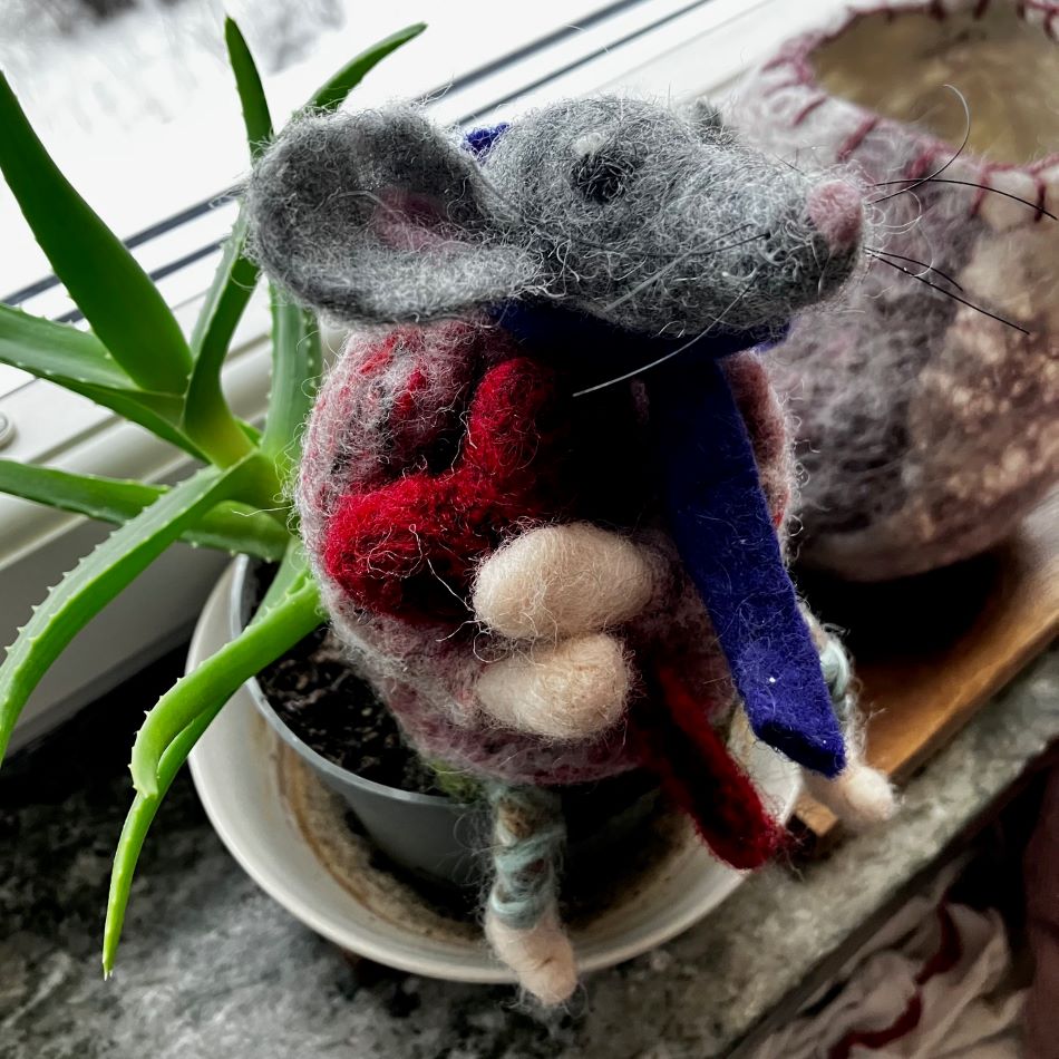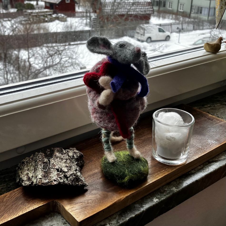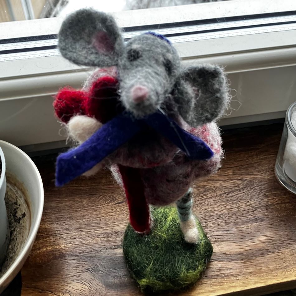 Hjärtmus, en söt liten mus som sitter eller står. Nålfiltad i ull och har ben, armar och svans som går att positionera i olika ställningar. Även huvudet går att vrida på (ej leksak). I sina armar håller han ett rött hjärta. Design Nettans Ullisar Stående är hjärtmusen cirka 19 cm hög. Väger cirka 26 gram totalt.