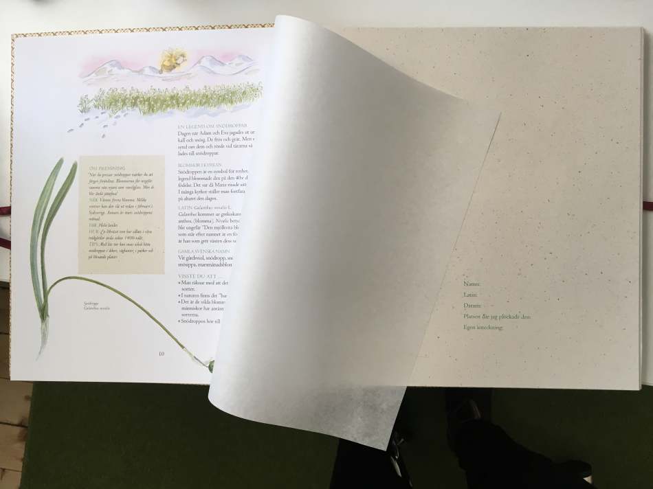 Varje blomma presenteras på tre sidor, på den fjärde sidan finns plats för att pressa en blomma du själv plockat samt fylla i var och när du plockat den. Detta är en flora, växtpress och herbarium i ett! Passar från 6 till 99 år. Snödroppe, Tussilago, Vitsippa, Vårlök och 14 andra blommor finns med. Dessutom finns anvisningar om hur man pressar växter (längst bak i boken finns en växtpress i kartong).