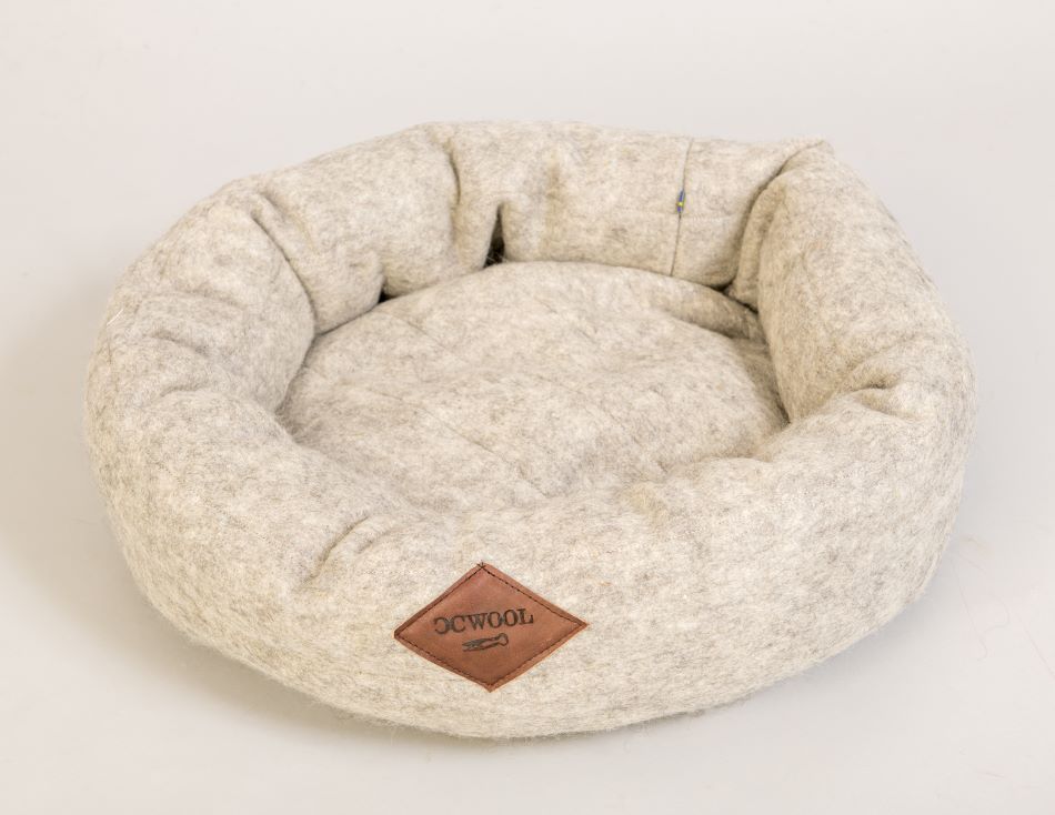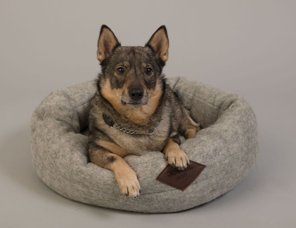 Hundbädden är gjord av en nålfilt i 100% svensk ull med läderdetaljer av svenskt läder.