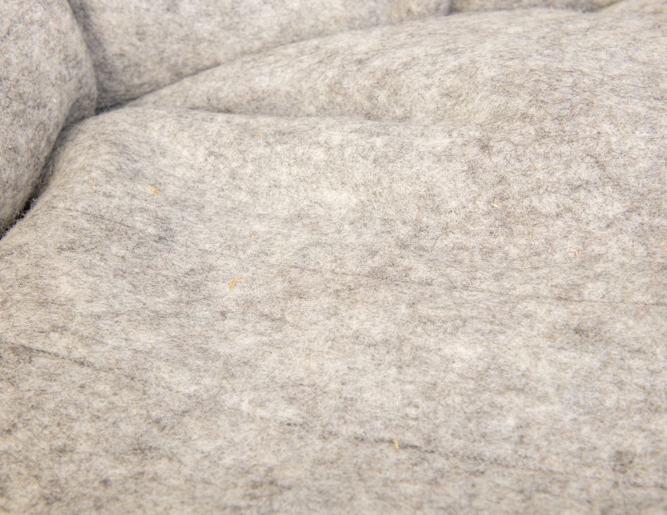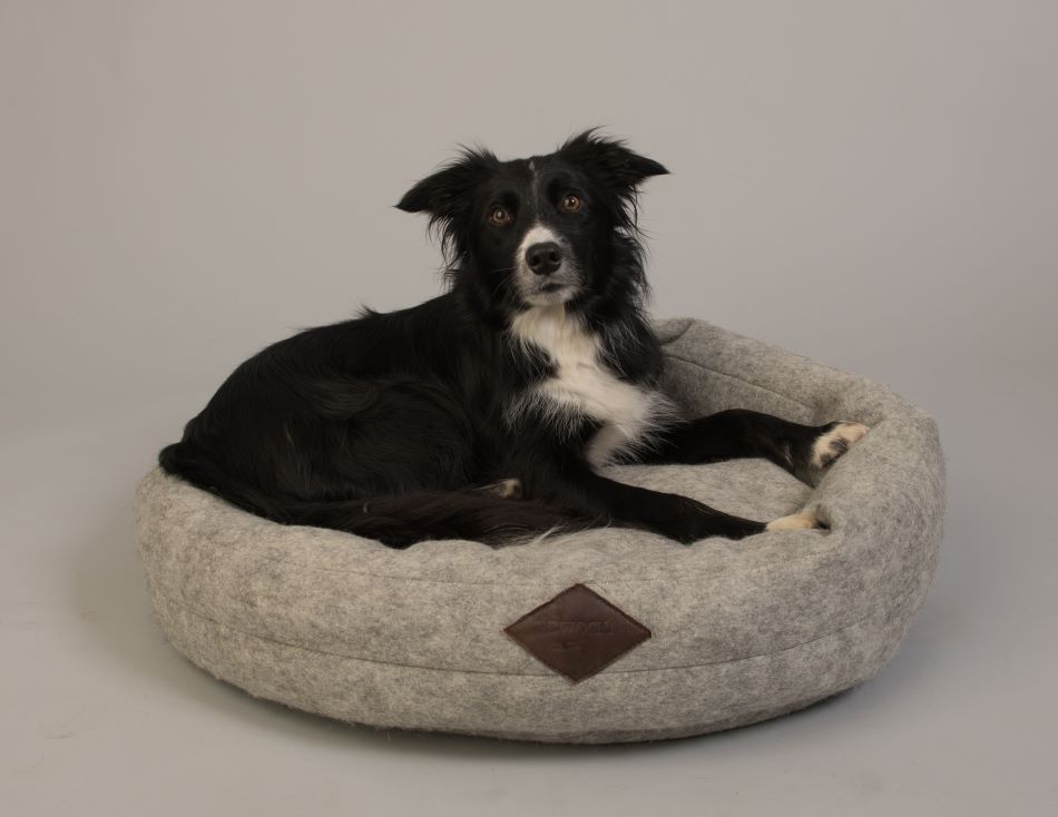 Hundbädden är gjord av en nålfilt i 100% svensk ull med läderdetaljer av svenskt läder.