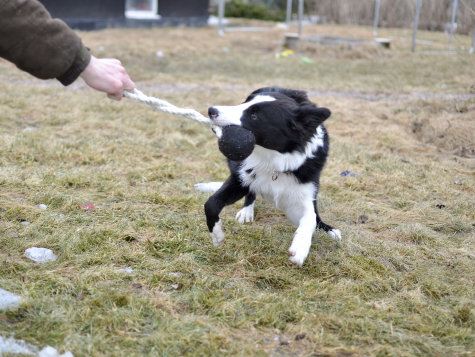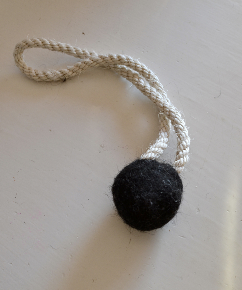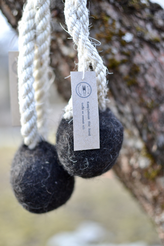 Leksak för din hund. Hårt tovad ullboll som sitter fast ett slitstarkt rep. Perfekt som kampleksak och aktivering.
