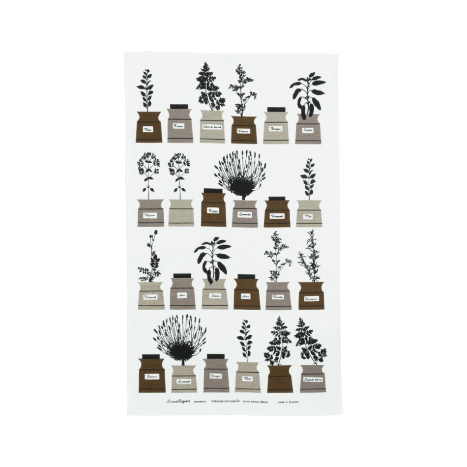 På 1950-talet var tryckta handdukar en nyhet som snabbt vann popularitet i Sverige. Ett av de mest framträdande mönstren från den tiden är Astrid Sampes "Persons kryddskåp", skapat som en hyllning till keramikern Signe Persson Melin. I början av 50-talet designade Persson Melin en serie kryddburkar i keramik med korklock, och Sampes mönster blev mycket omtyckt. Det är fortfarande ett av våra mest älskade mönster. I vår senaste kollektion finns kökshandduken "Persons kryddskåp" i en ny färgkombination: gråbrun.