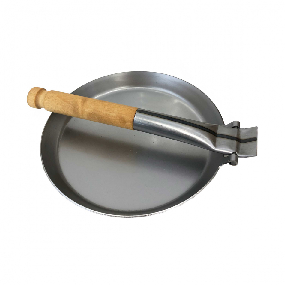 Stekpanna tillverkad av kolstål med vikbart handtag med björkskaft. Ytan är smord med vegetabilisk olja.Handtaget är 26 cm långt.Pannans diameter är 21 cm.Vikt: 0,63 kg.