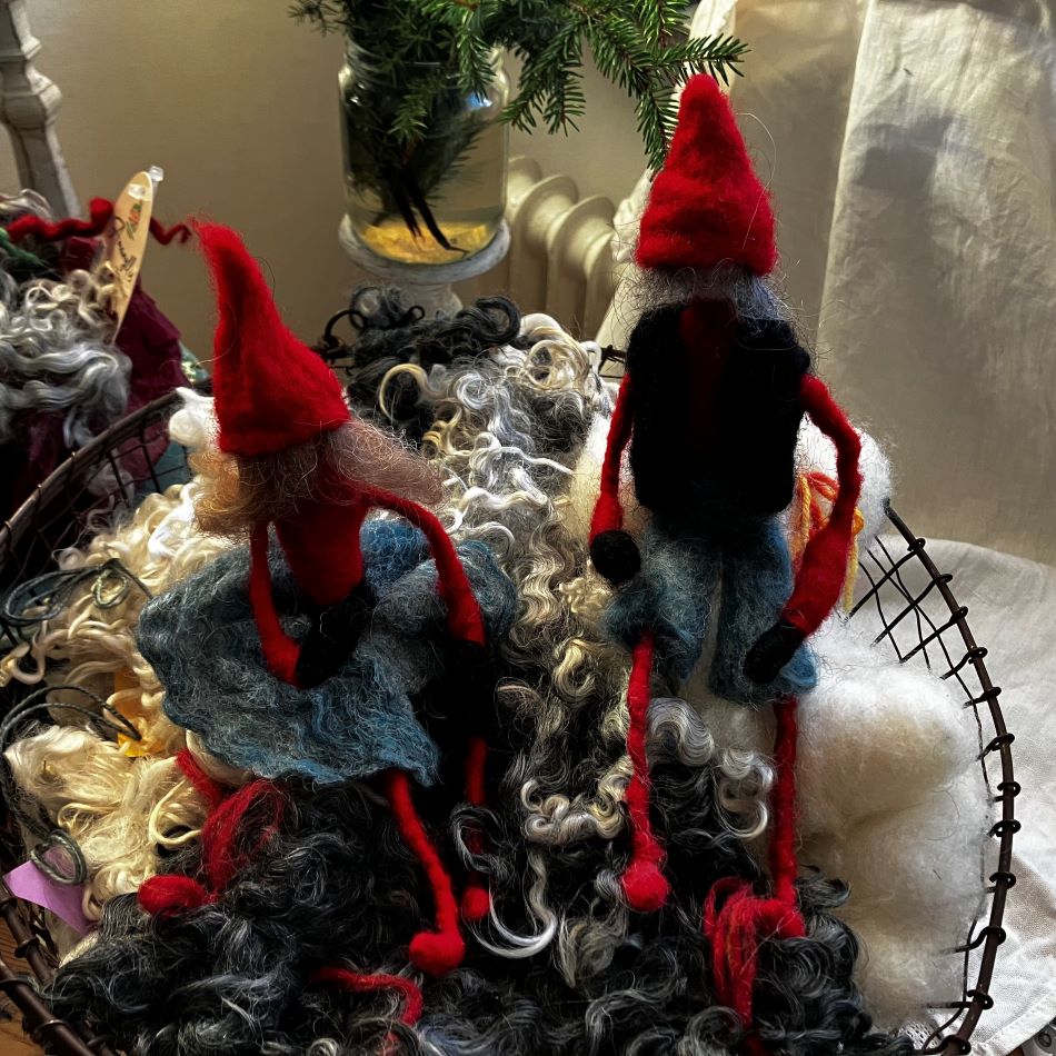 Charmiga julnissar handgjorda av svensk ull. Kroppen är av ståltråd så du kan böja armar och ben. De säljs i par och är cirka 25 cm långa. Du kan även sätta de i julgranen eller dekorera ljusstaken med dem.