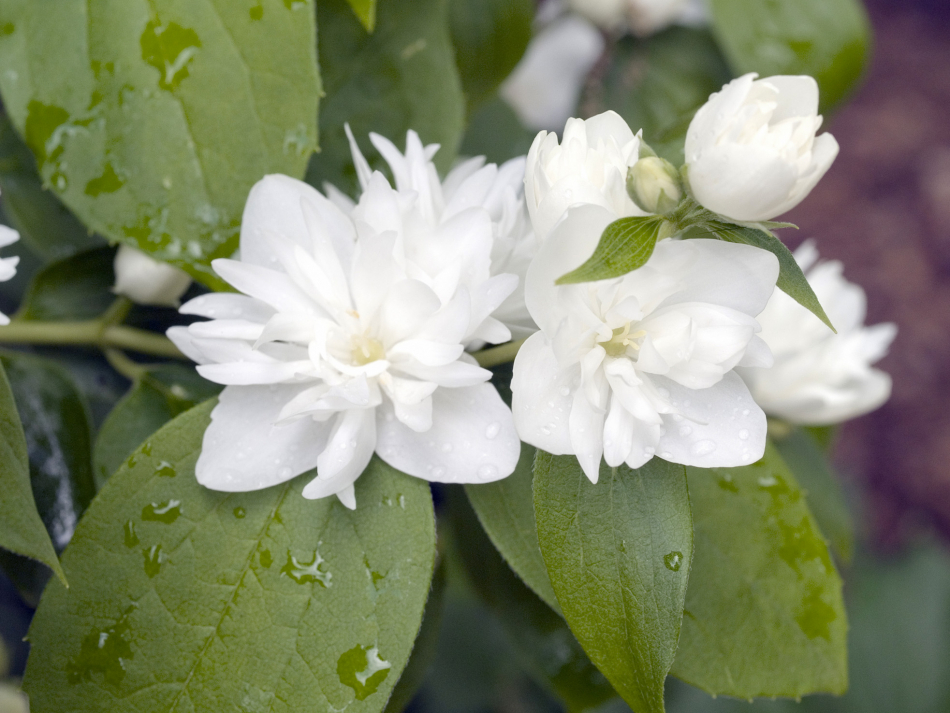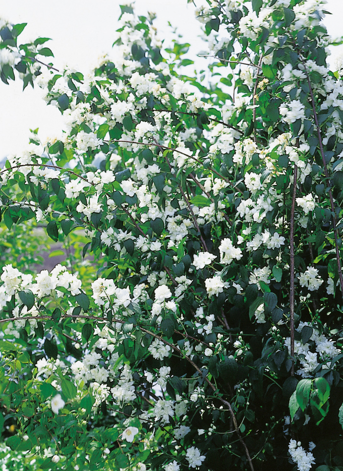 Philadelphus Virginalis (hybrida) Kameliaschersminen är en mycket dekorativ doftande buske