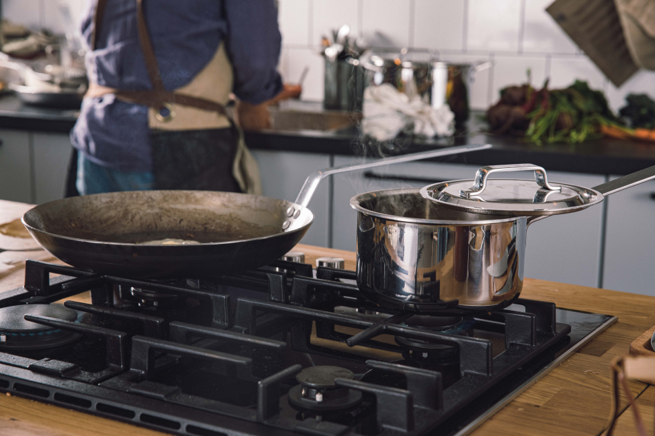 Kastruller tar plats. Stapelbart är ett måste i proffsköket.
