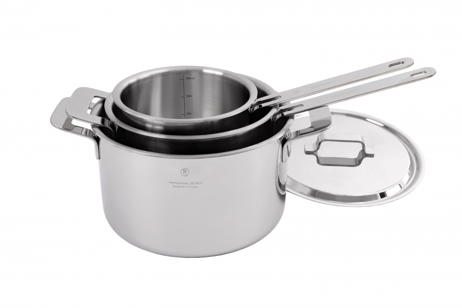 - Tre stapelbara storlekar av kastruller, även de mindre locken staplas inuti den största kastrullen