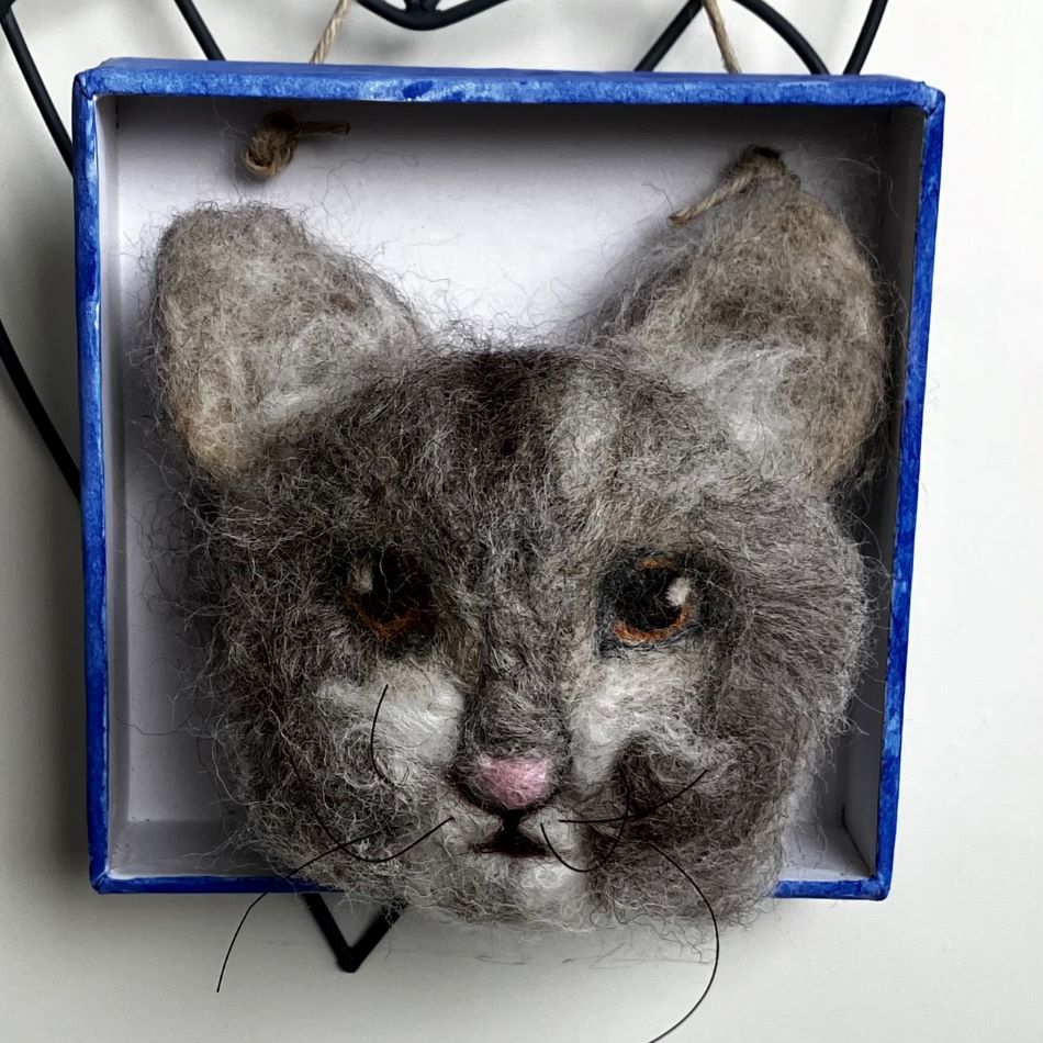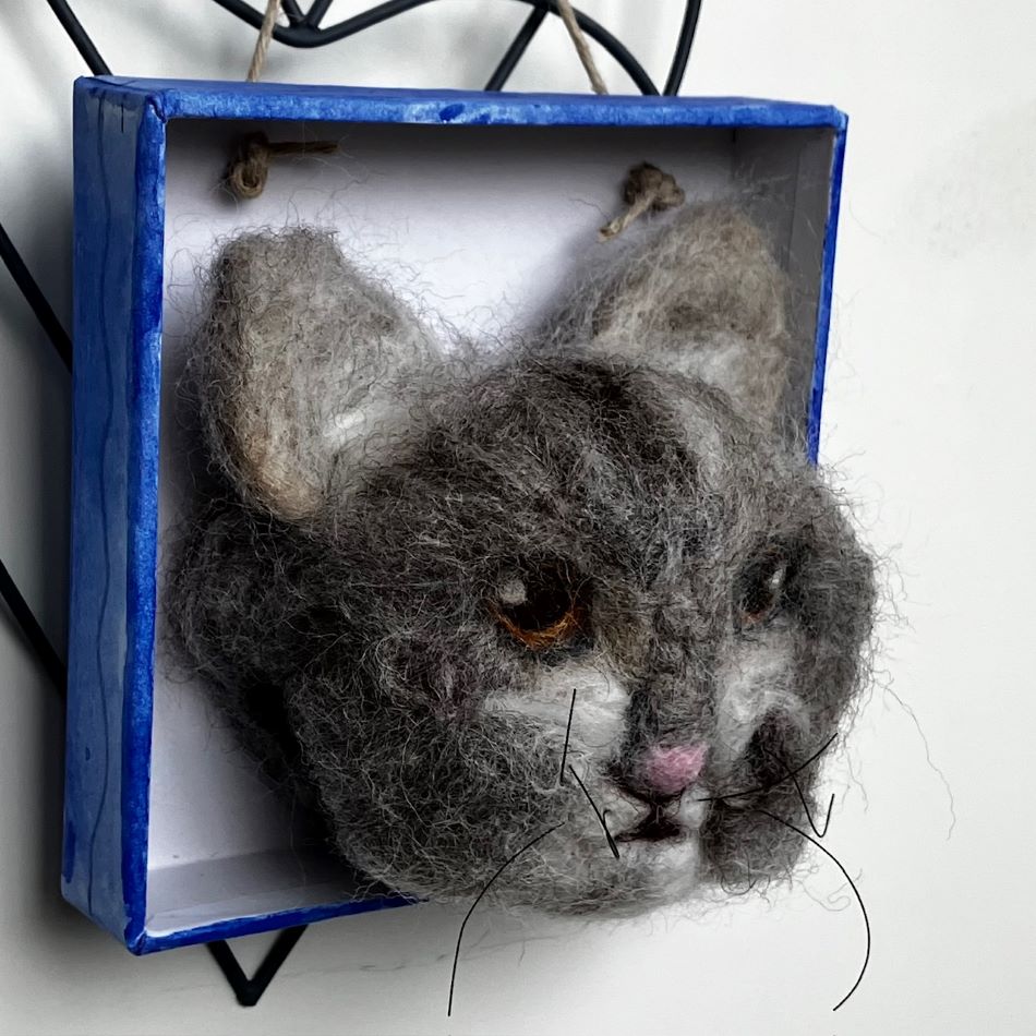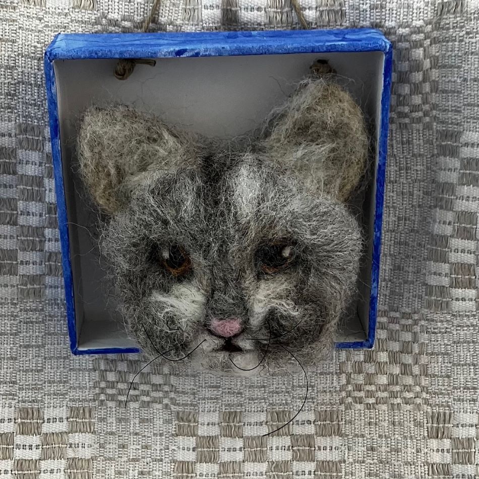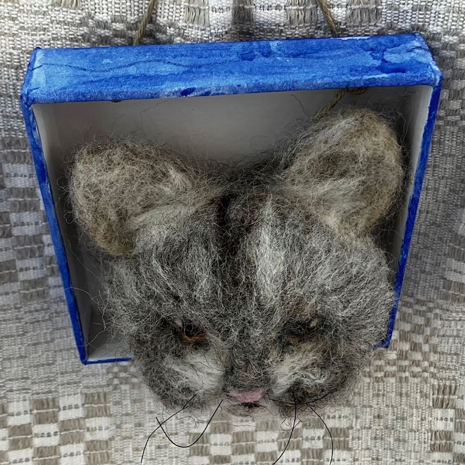 Liten tavla med katthuvud i ull.