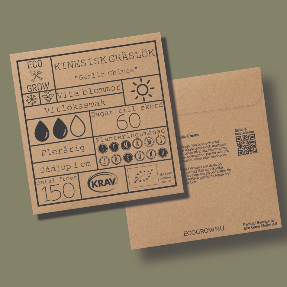 Kinesisk Gräslök Garlic Chives - är en smakrik örtkrydda med långa, fina blad och mild smak av vitlök. Bladen blir något längre och kraftigare än traditionell gräslök. De dekorativa, vita blommorna är ätliga och uppskattas av pollinatörer, passar även till eterneller. Används till sallader, såser eller marinader. Lämplig för infrysning.