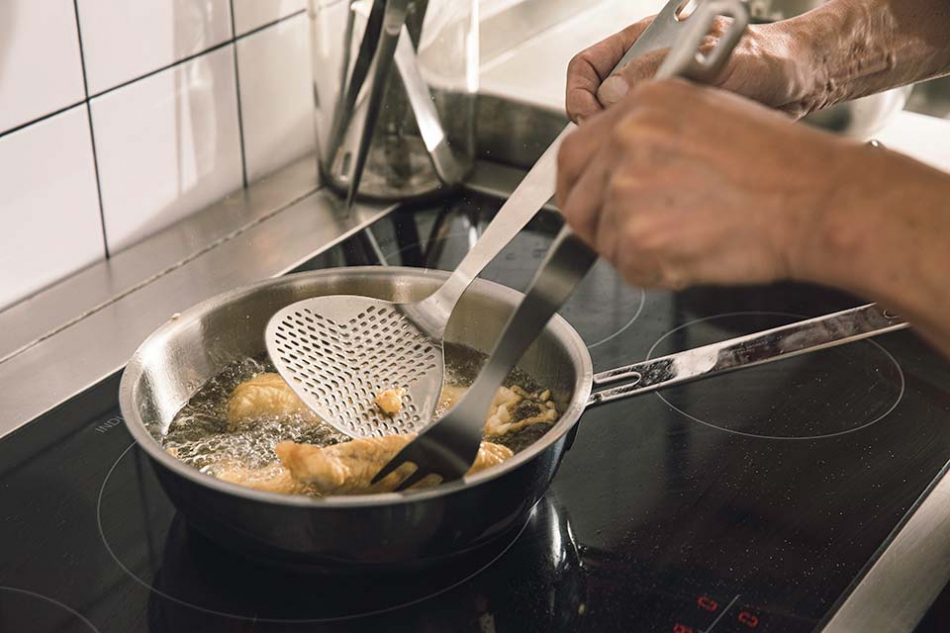 Det vi kallar "matlagningssked" är en förstorad sked som hemmakocken kan använda till många olika praktiska moment, från tillagning till servering. Handtaget är aningen breddat för bättre och skönare grepp.