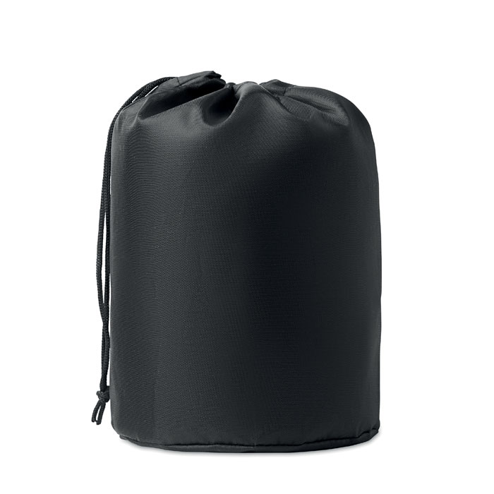 Set med 2 campinggrytor med bestick i rostfritt stål i en påse så att allt hålls på plats i väskan. Hela setet är utformat för att ta upp så lite utrymme som möjligt, så de två grytorna passar i varandra, kärlen har vikbara handtag och även kniven, gaffeln och skeden kan vikas ihop.