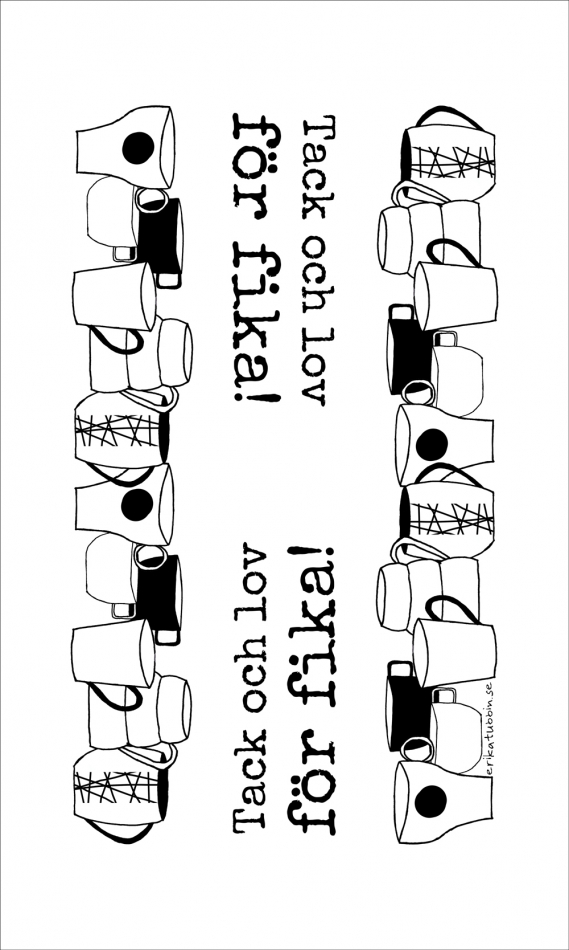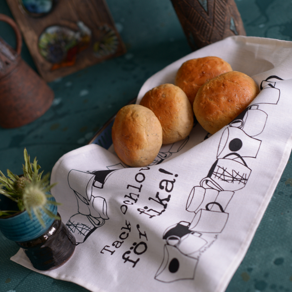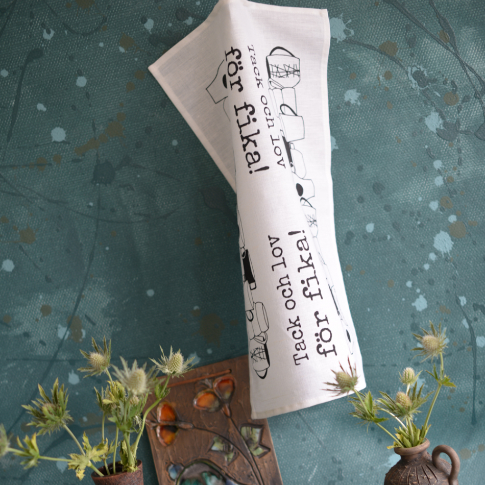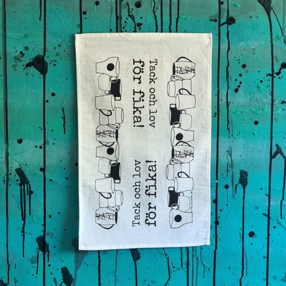 Mindre kökshandduk med TACK OCH LOV FÖR FIKA-mönster. Kan också användas som brödduk, servett eller bordstablett.