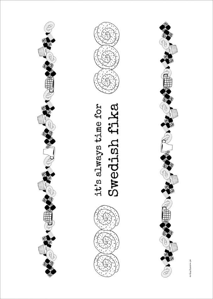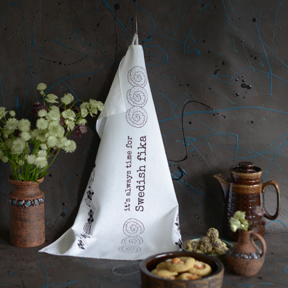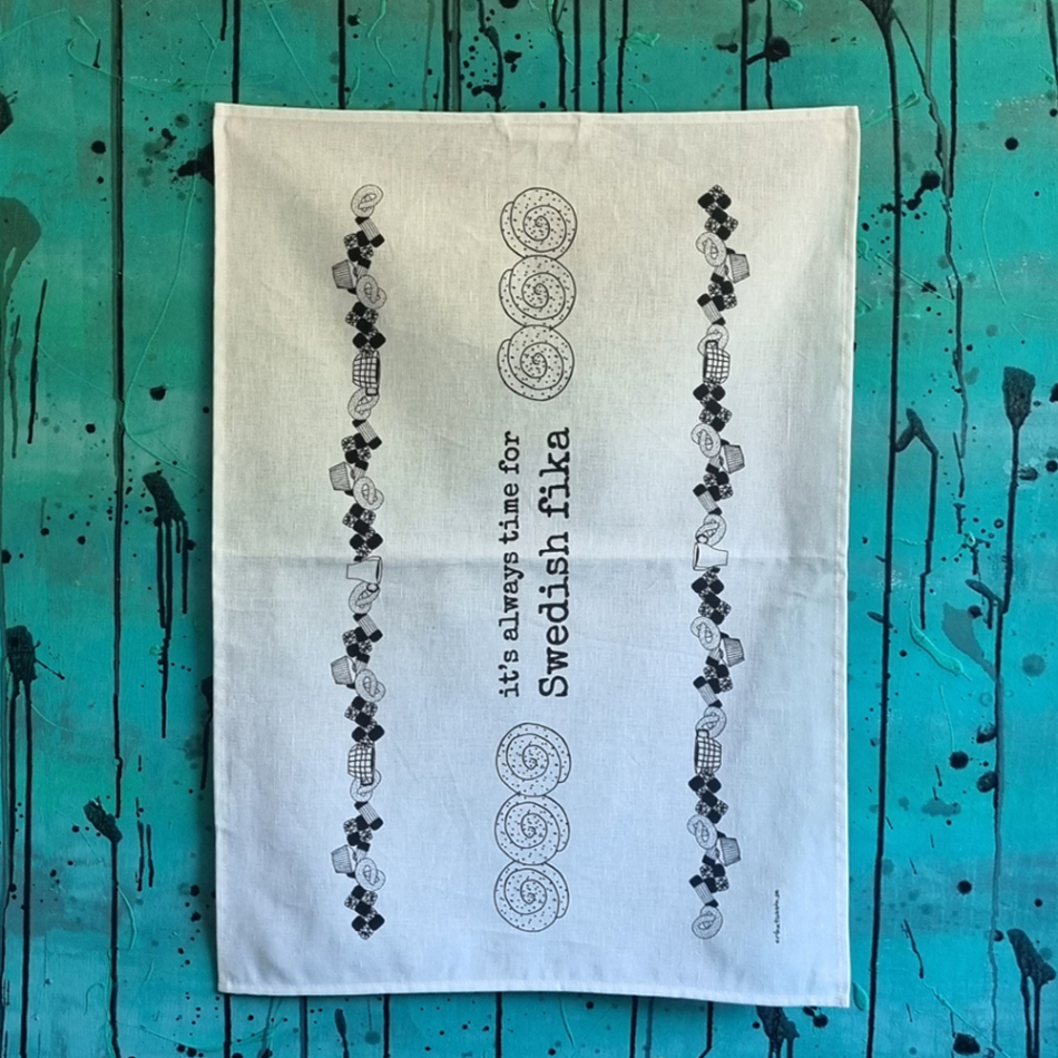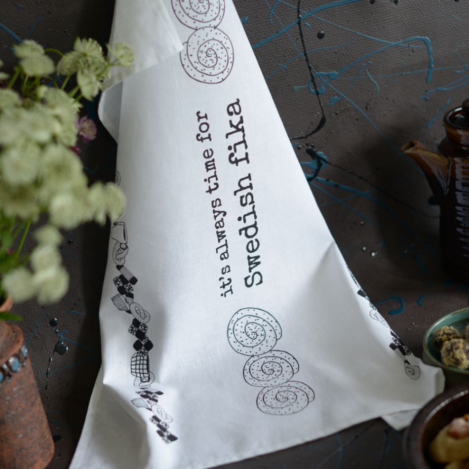 Kökshandduk i design av Erika Tubbin. Ingår i kollektionen Swedish fika. Vit kökshandduk med svart tryck och texten: "it's always time for Swedish fika". Kvalitetshandduk tillverkad av linne och bomull.