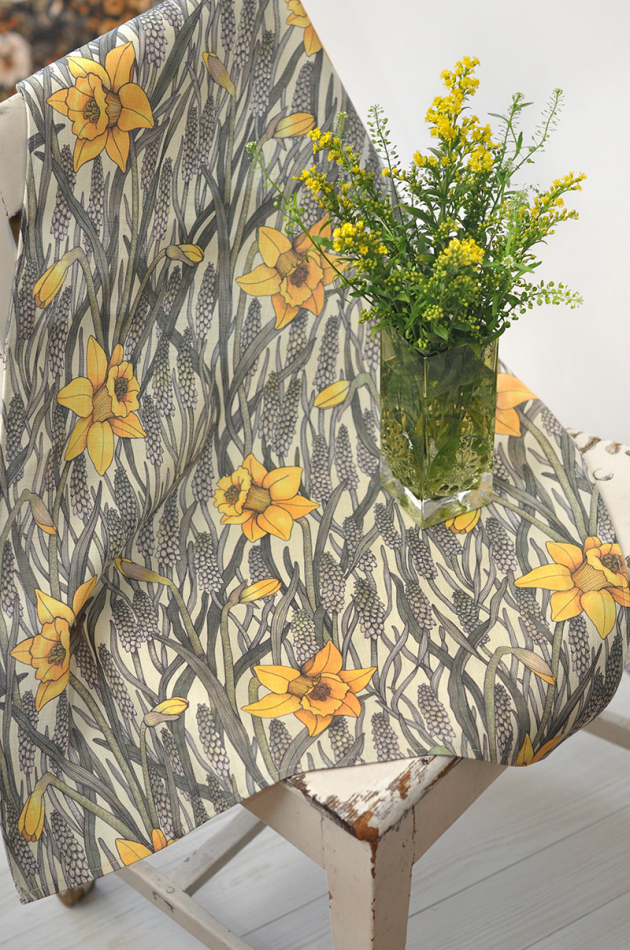 Kökshandduk i bomull/lin och mönster Vårpärlor vårgrön-gul.