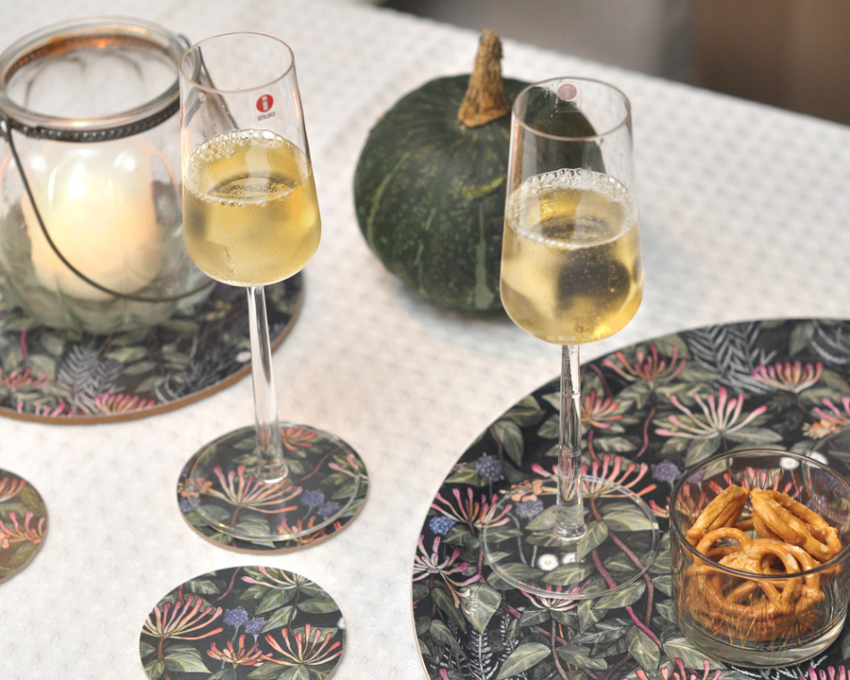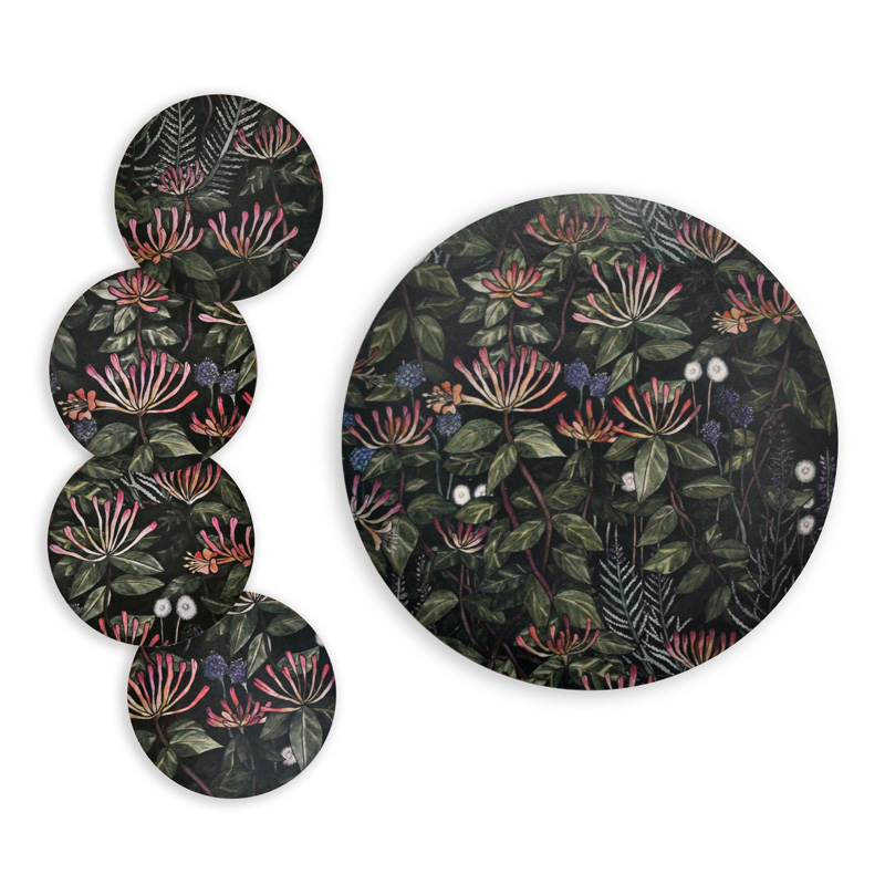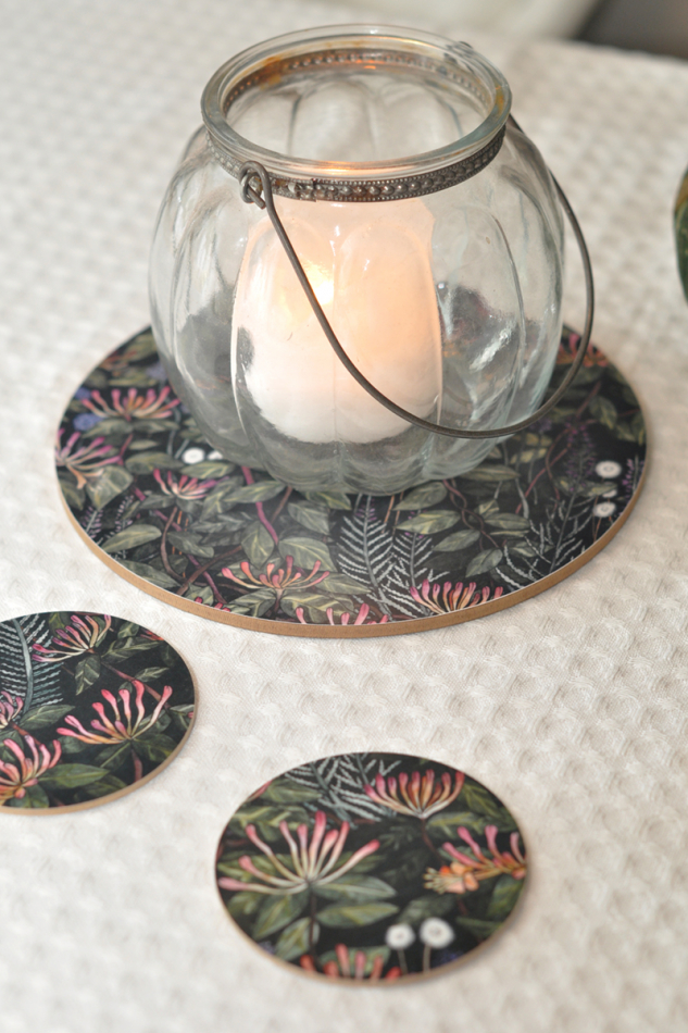 1 st grytunderlägg + 4 st glasunderlägg, i mönster Kaprifol.