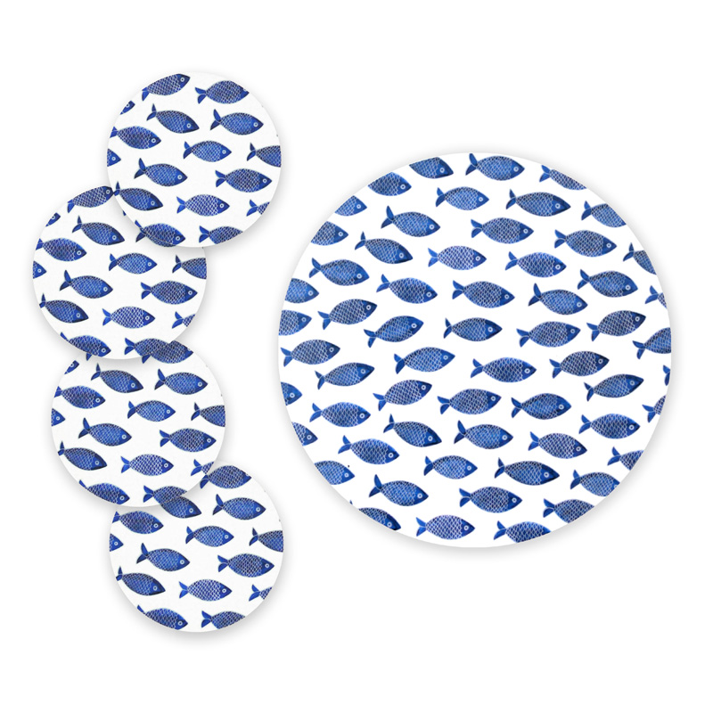 1 st grytunderlägg + 4 st glasunderlägg, i mönster Fisklek