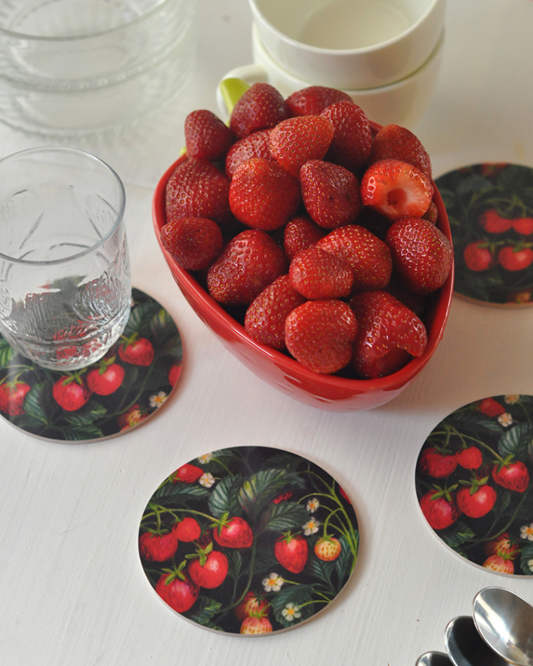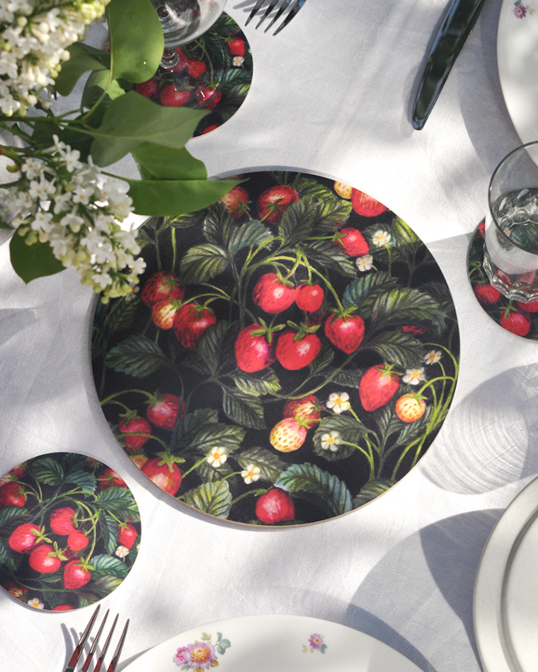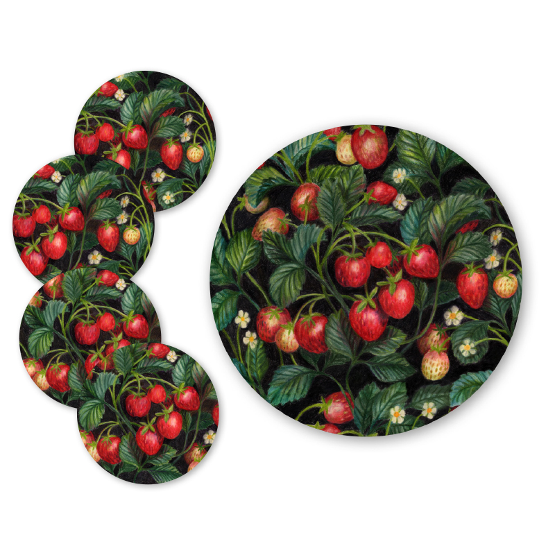 Paket med 1 st grytunderlägg i formpressat trä, 21 cm och 4 st glasunderlägg, 9 cm. Mönster Jordgubbslandet med jordgubbar, blad och blommor. Svensktillverkade.