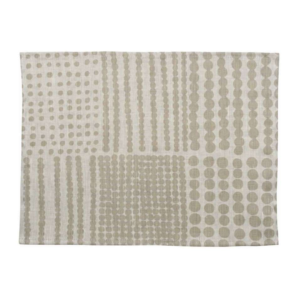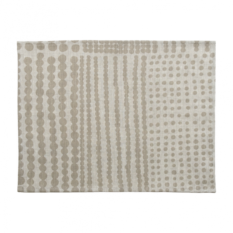 Pricktyg kännetecknas av en grafisk enkelhet där varje prick är handmålad och placerad med omsorg. Pricktyg natur/taupe har en mjuk beige ton tryckt på oblekt linnetyg som har en härlig levande yta.