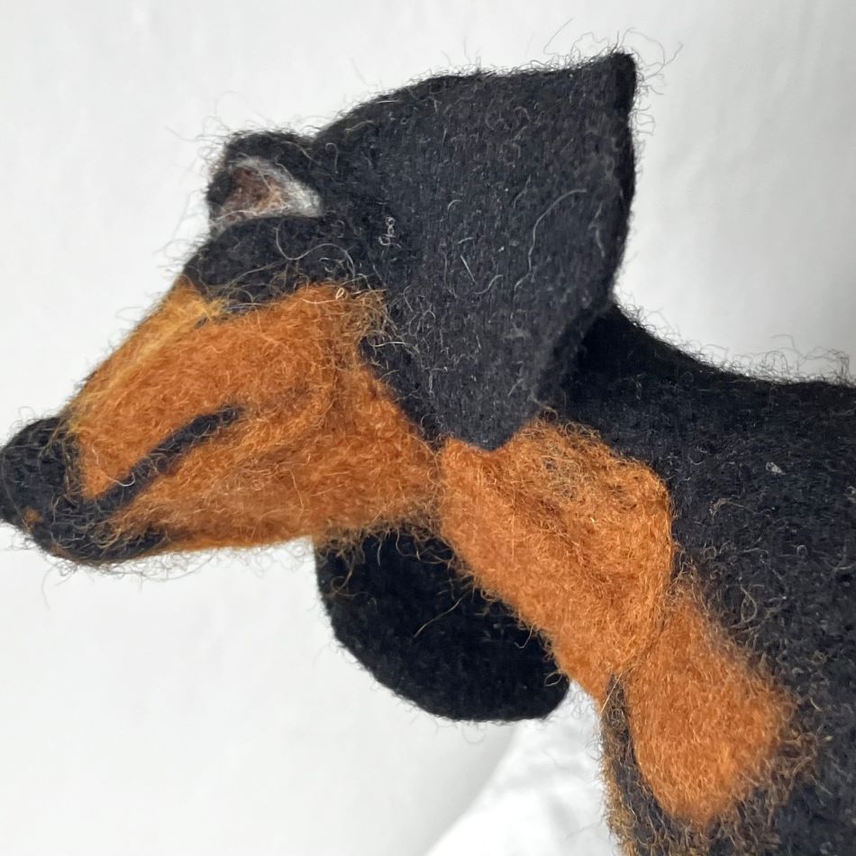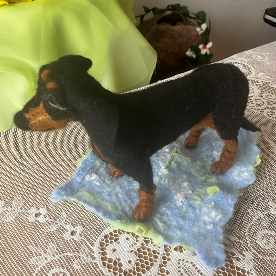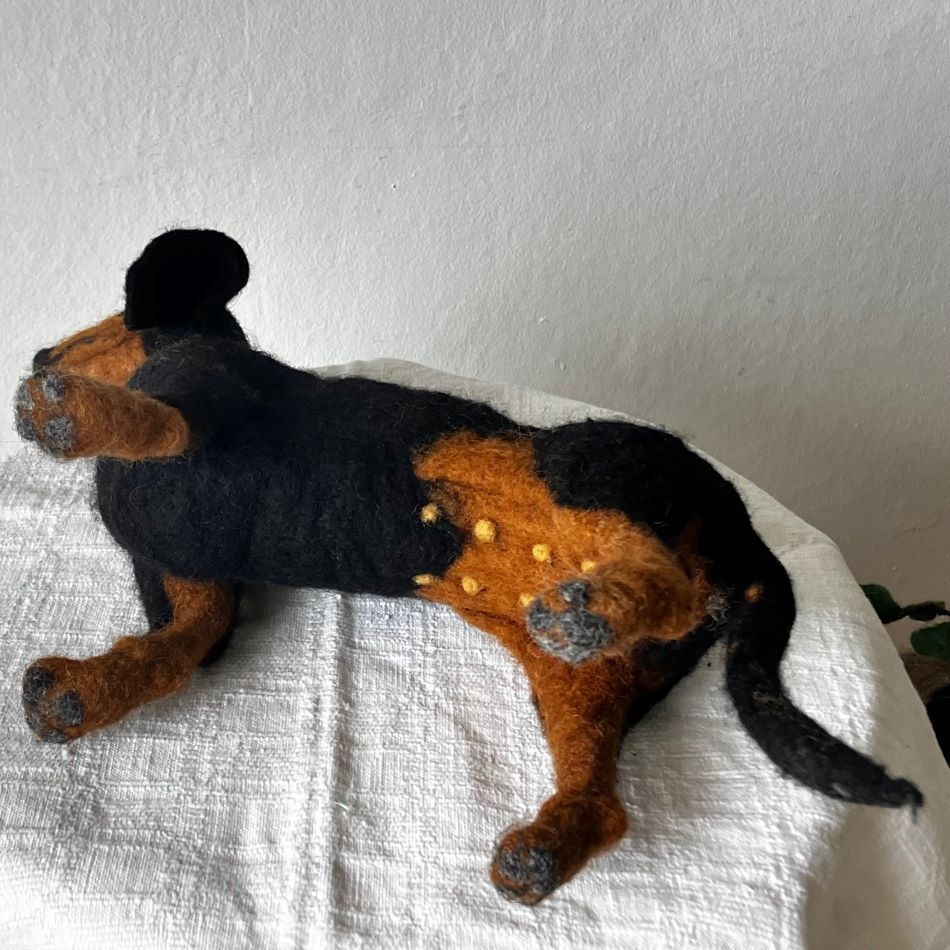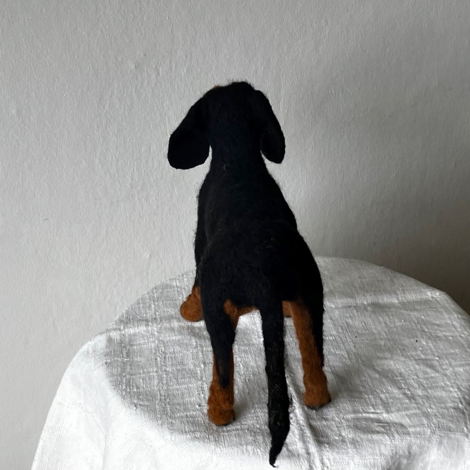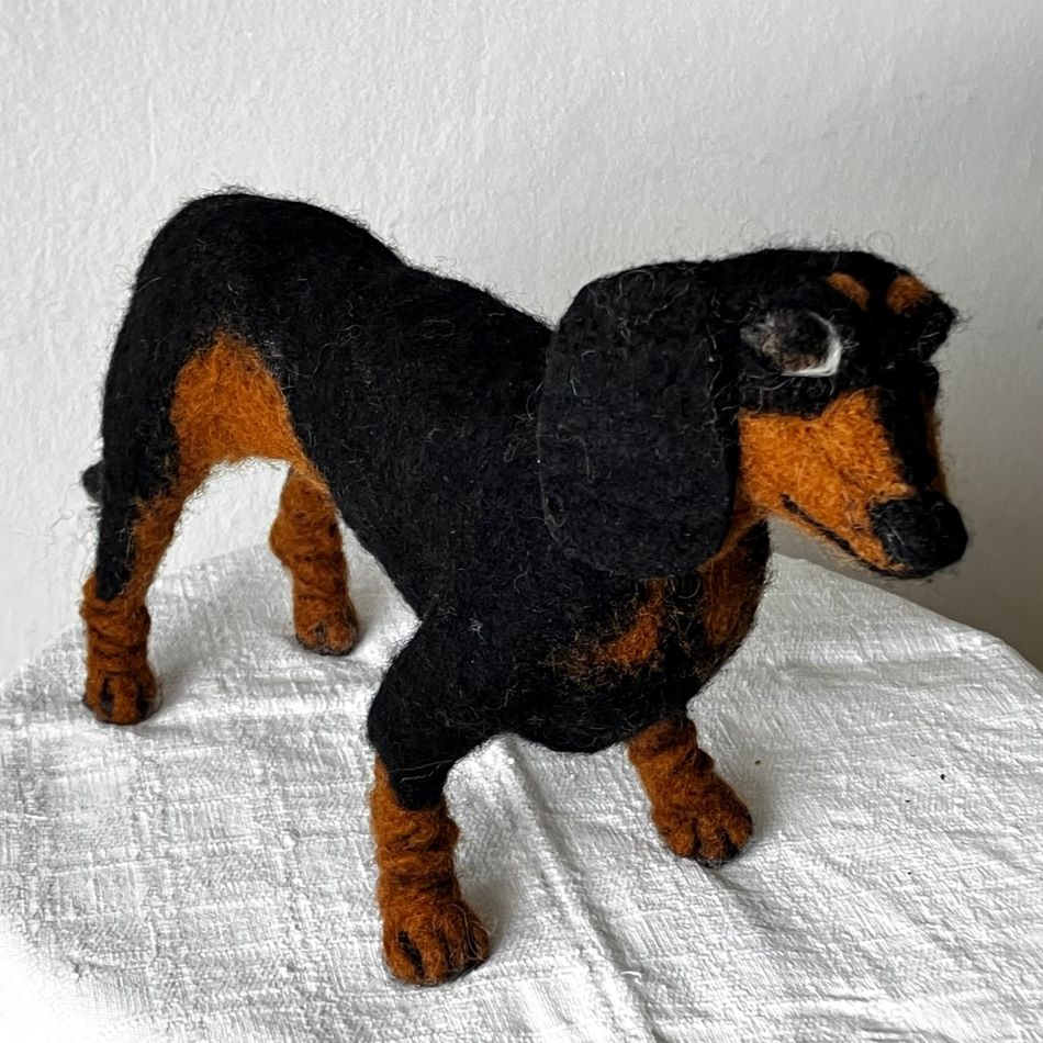 Taxen Donna är en miniatyr av en korthårig tax i färgen svart och brun. Heltigenom nålfiltad av ull. Hennes öron är våttovade och blev filtöron. Ögonen är även de i ull. Hunden Donna väger cirka 100 gr och kroppen är uppbyggd på en ståltråd vilket gör att ben och huvud kan ändra position lite försiktigt om man vill. Den svarta pälsen är av mjukaste fina merinoull och man vill inte sluta att hålla Donna. Jag har även försökt att det lite veckade skinnet på tassar och hals ska synas och har återskapat taxen så naturtroget jag kan med viss reservation för lite egna utsvävningar i hantverket. Inspiration har varit bilder på taxar på nätet. Vill du ha en avbild av din hund kontakta Nettans Ullisar via mejl lindstromannette@gmail.com