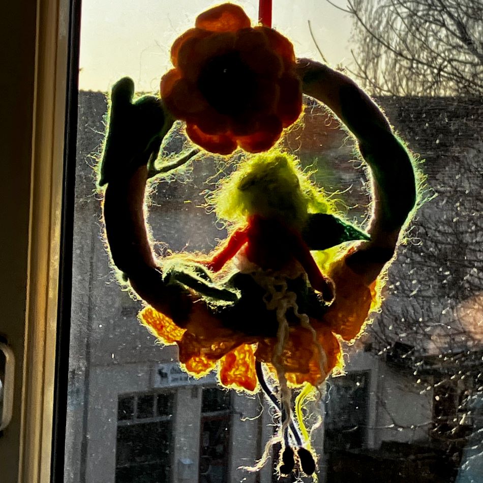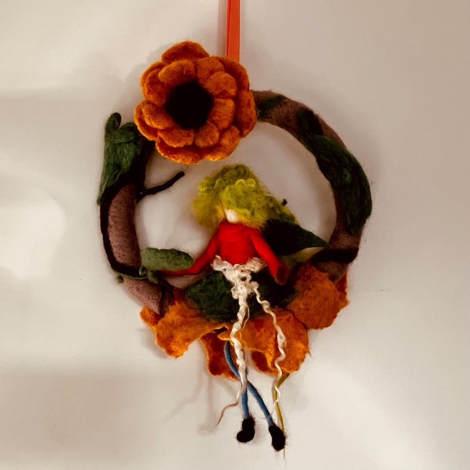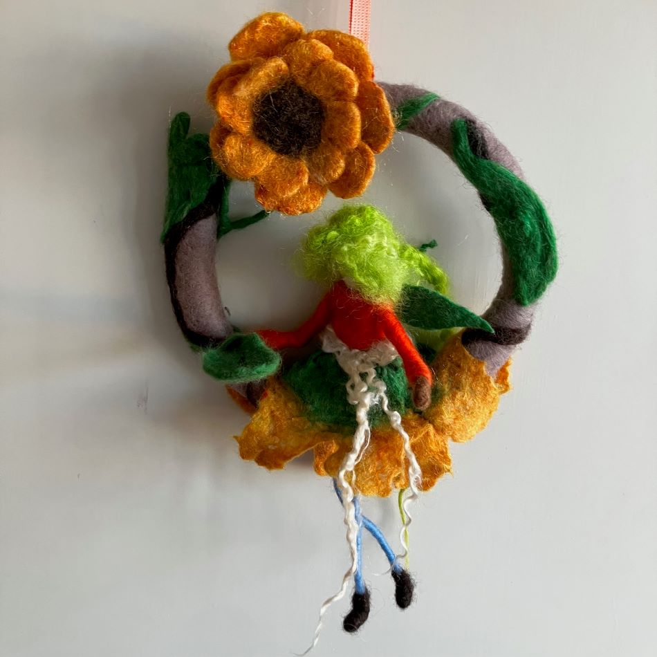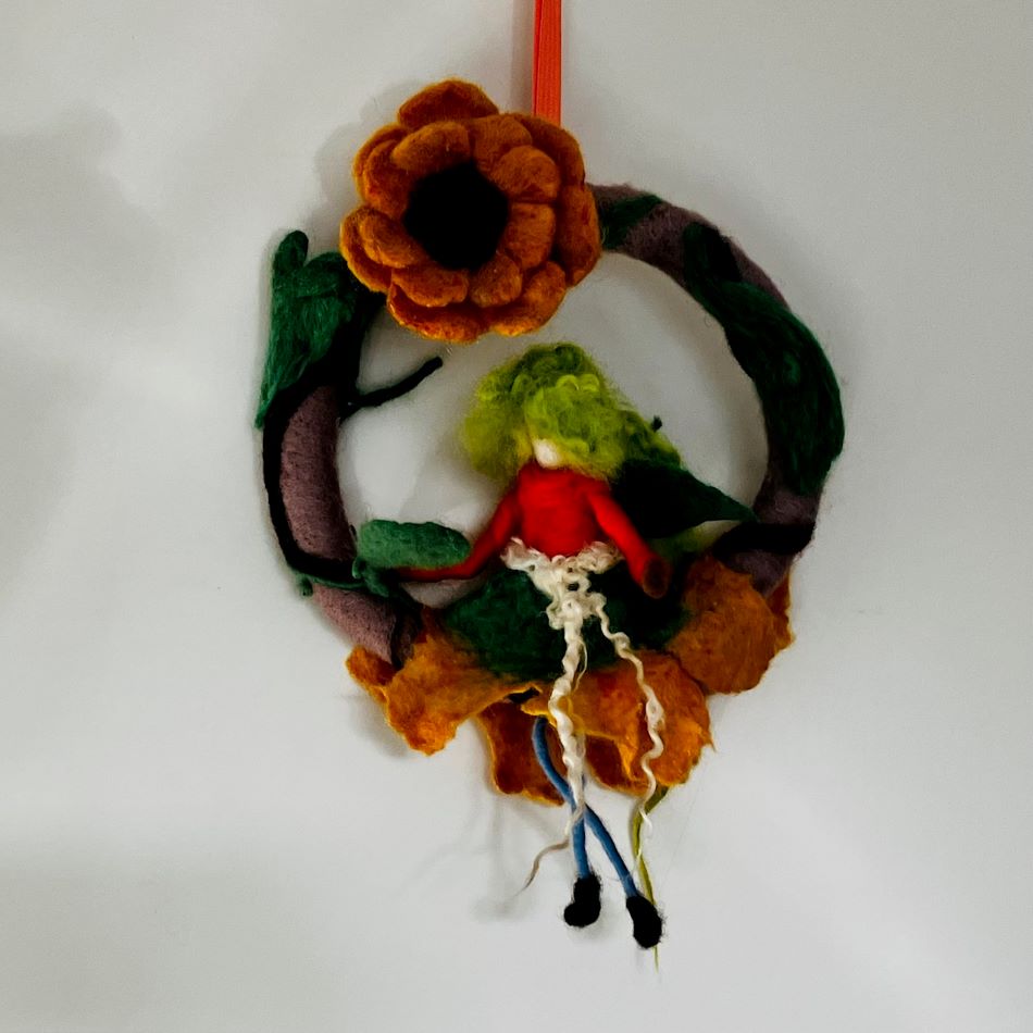 Dörr eller fönsterkrans som är nålfiltad i ull. Tema är sommar och solros. En älva sittande i kransen med en solrosblomma. Design Nettans Ullisar Diameter cirka 18 cm.