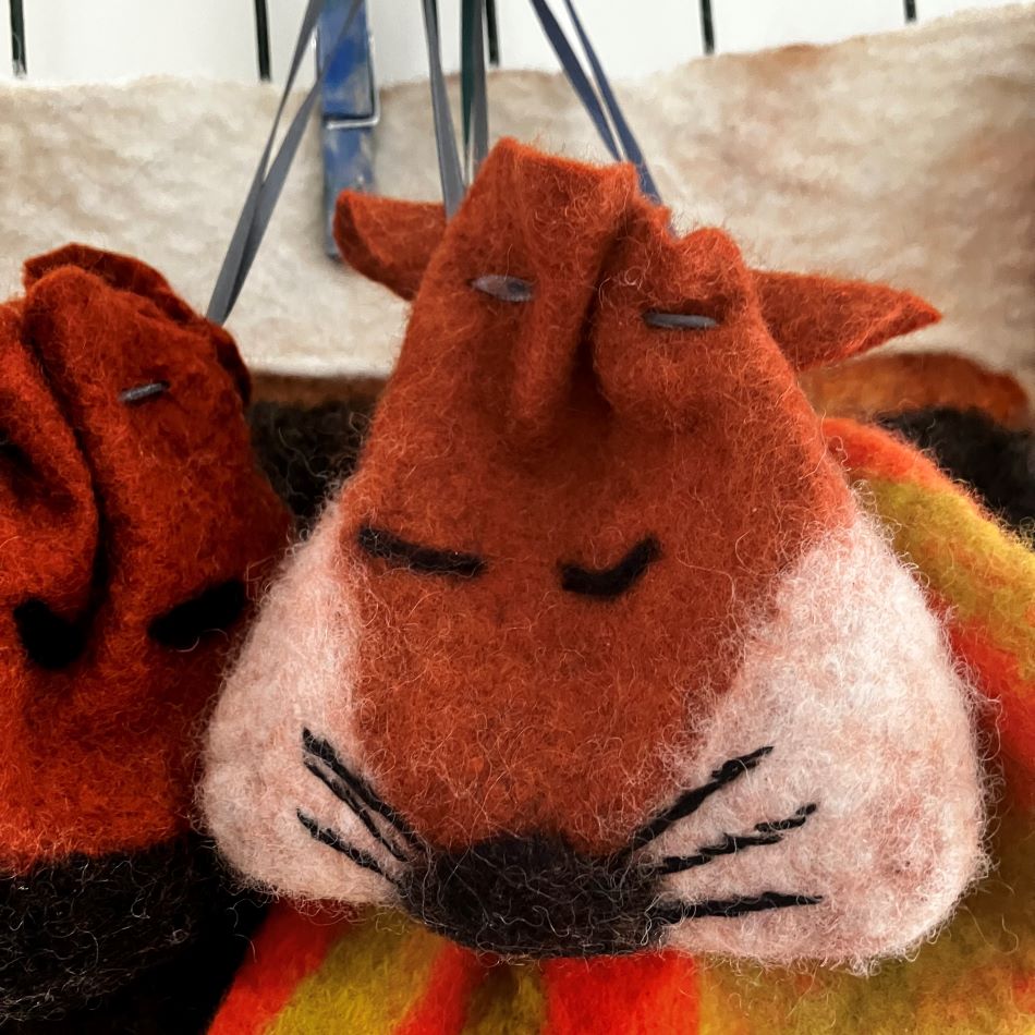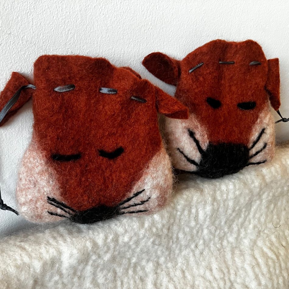 Handgjord våttovad liten förvaringsväska för smycken, småsaker. Häng den på din lite större väska eller varför inte sätta en liten glaskruka i och använd som vas med vackra blommor i. Ullen är av merinoull design Nettans Ullisar. Ingen påse är den andra lik men färgerna är brun och med nåltovad dekoration i form av en räv. Påsen stängs med ett sidenband och stopper är små öron i ullfilt. Cirka mått längd 12 cm och bredaste 10 cm väger cirka 12 gr.