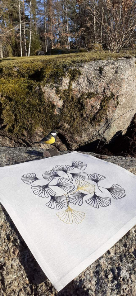 Duk sydd med bomullsgarn med stjälksöm på halvlinne. Färdigt mått 42x42 cm. Alla bladparen utom ett sys med svart tråd. Ett sys med vårligt gulgrönt,.