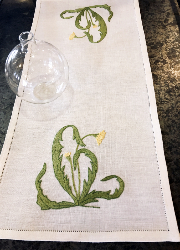 Komplett materialsats till liten linneduk med mönstret tryckt på tyget. Mått: 21x41 cm
