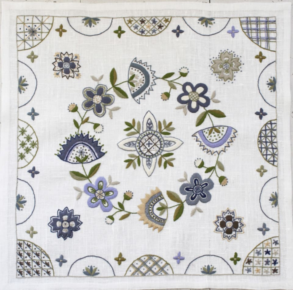 Innehåller linne med mönstret tryckt på tyget, nål, garnsats och sömnadsbeskrivning med stygnförslag. Meningen är att man ska sy "efter behag" och inspireras av garner och färgbilder. Du bestämmer själv stygn och var färgerna ska sitta. Garnsatsen är väl tilltagen.
