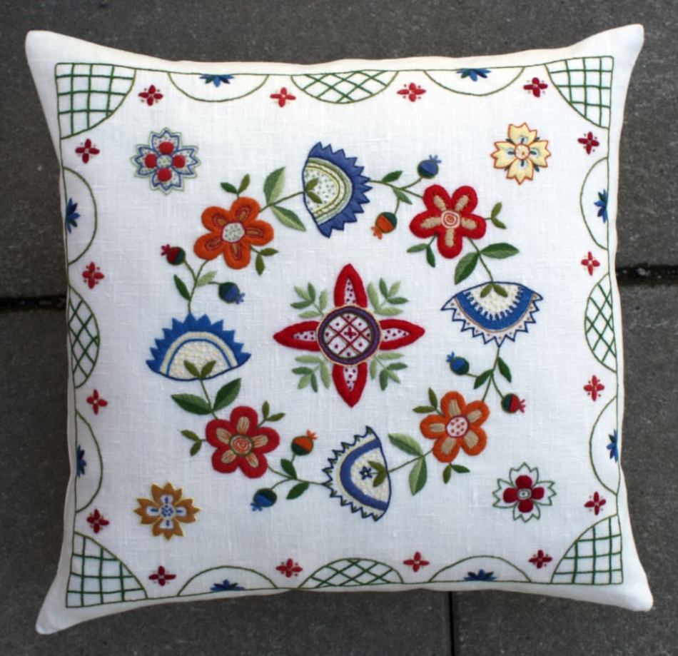 Innehållande fram och bakstycke med mönstret tryckt på tyget, nål, garnsats och sömnadsbeskrivning med stygnförslag. Meningen är att man ska sy "efter behag" och själv bestämma stygn och var färgerna ska sitta. Garnsatsen är väl tilltagen.