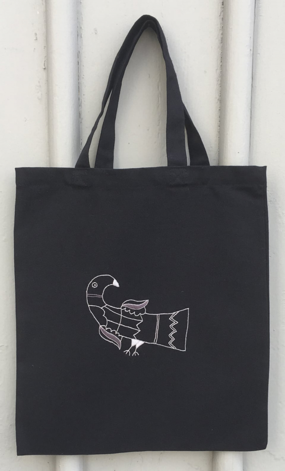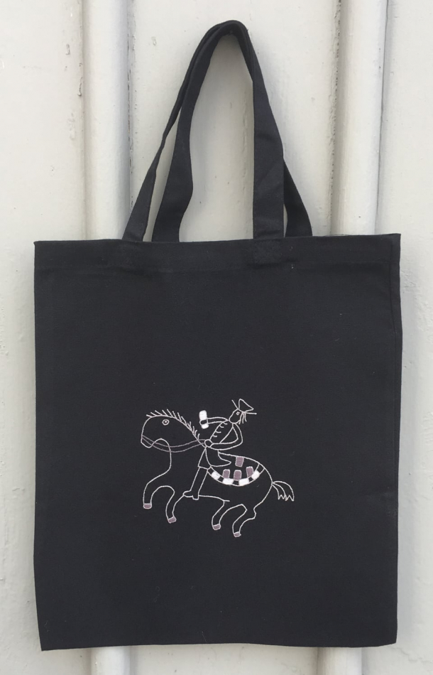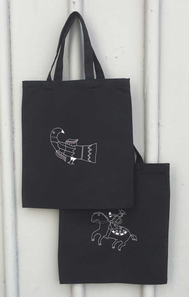 Två färdigsydda kassar med påtryckt broderimönster, den ena med "Häst" och den andra med "Fågel".