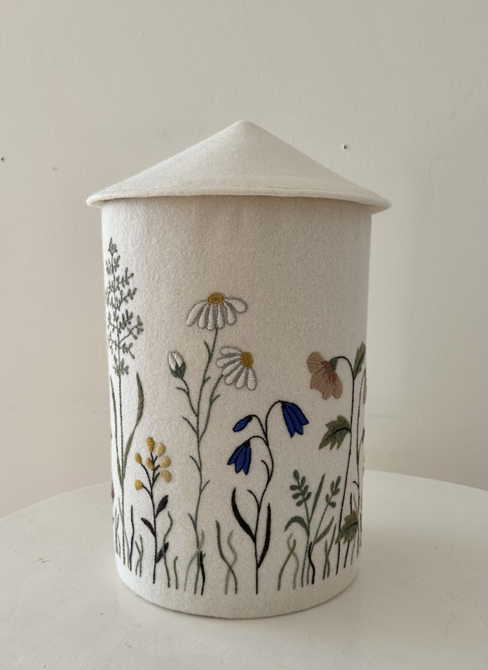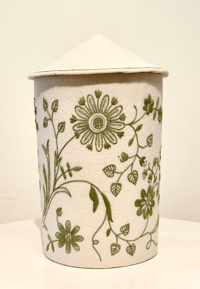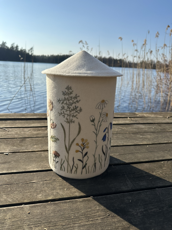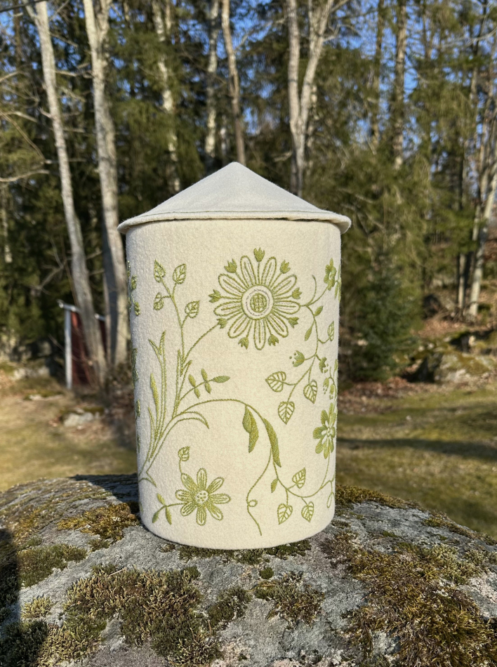 Broderiet är monterat på en kraftig pappcylinder med löst lock ovanpå.