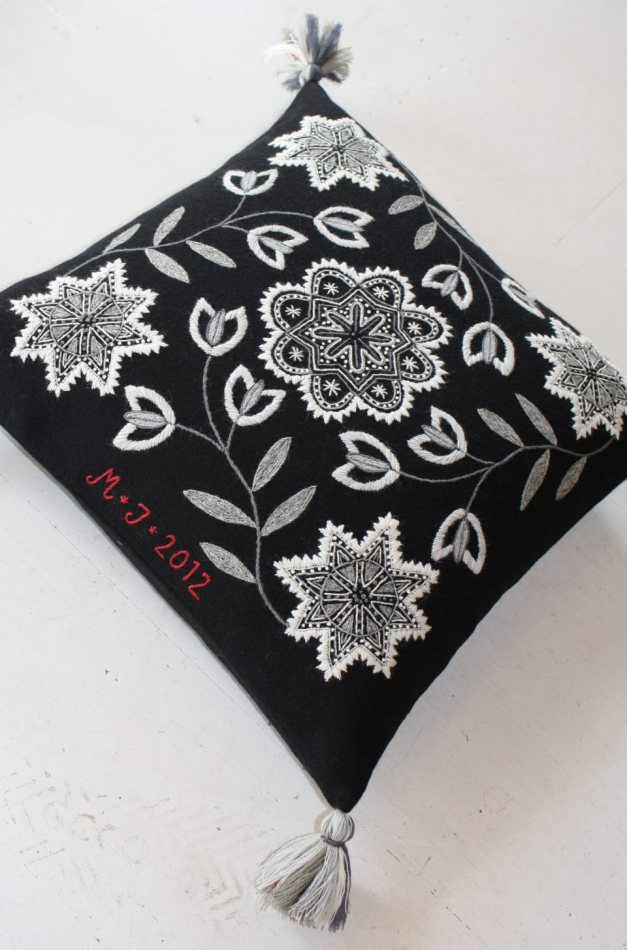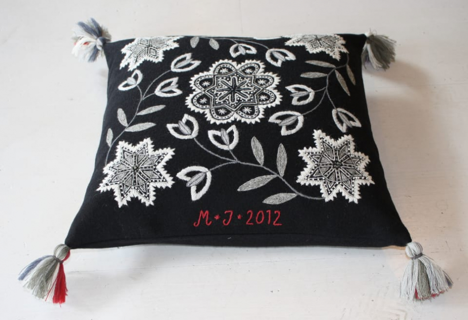 Mönstret är tryckt på tyget. Materialsatserna innehåller tyg, bakstycke, garn, nål och tydlig arbetsbeskrivning. Sömsätt: plattsöm, stjälksöm, knutar