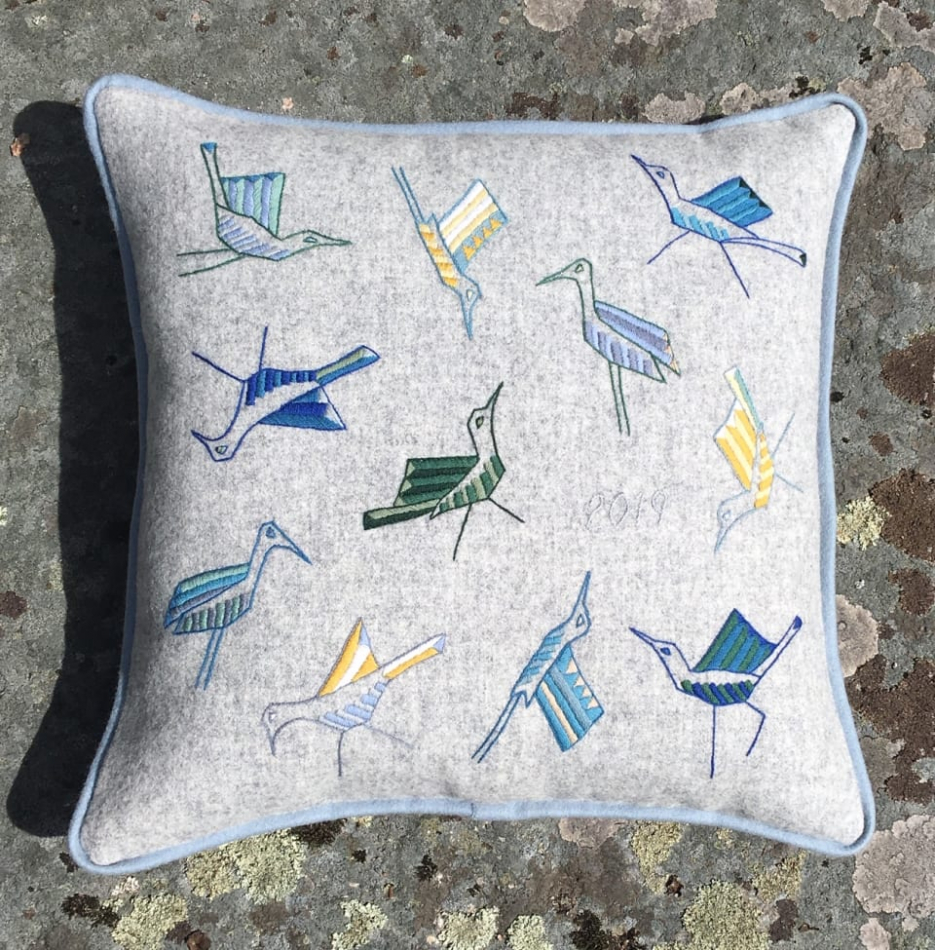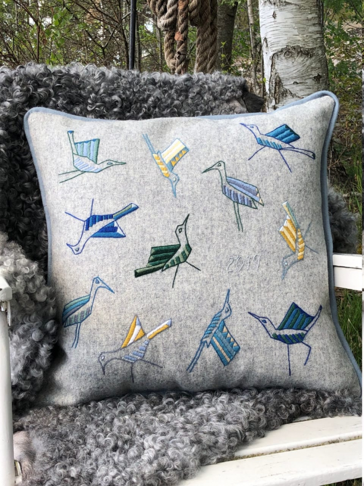 Kudde 50x50 cm tryckt på ljusgrått ylletyg med fåglar hämtade ur et 1920-tals broderi.