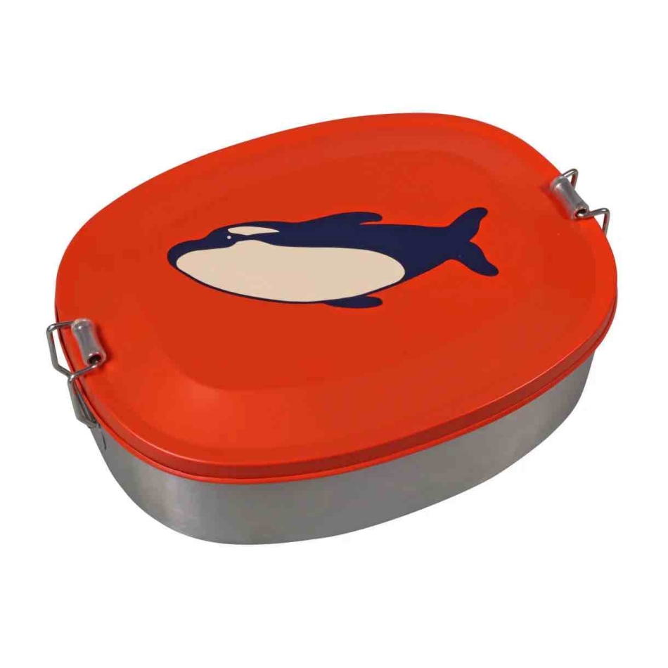 En simmande späckhuggare pryder denna giftfria matlåda för barn. Lådan är gjord helt i rostfritt stål. Locket öppnas och stängs med 2 lås som håller locket på plats. I samma serie finns även termosflaska för barn.