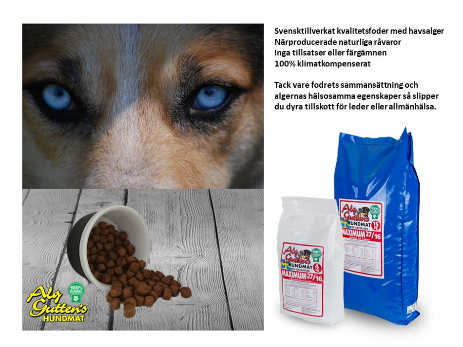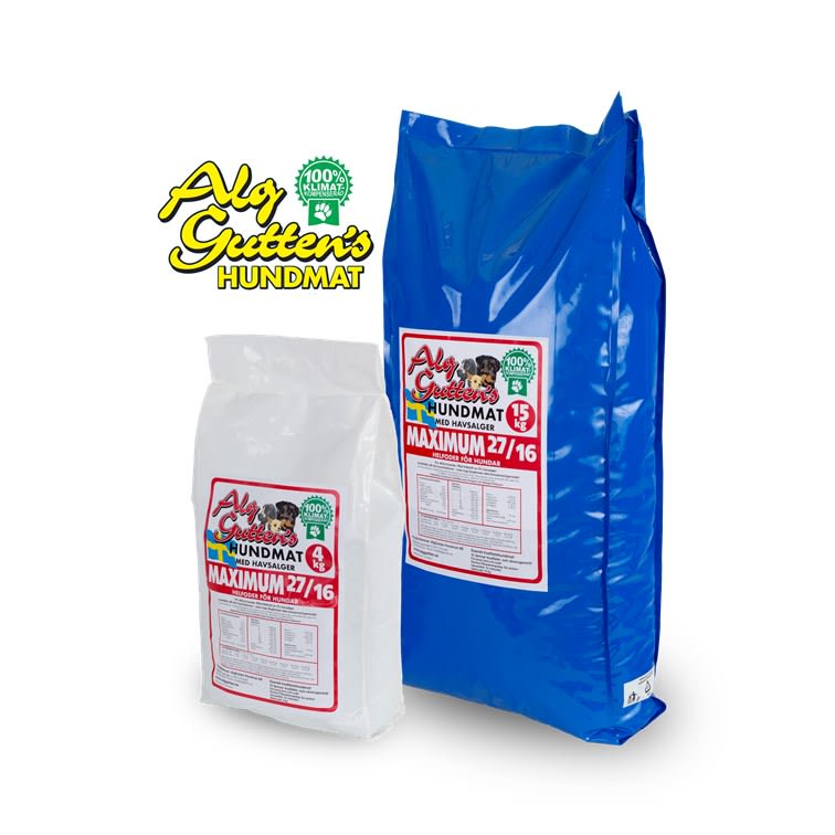 Maximum har en hög andel protein och en högre fetthalt som ger hunden maximal styrka och uthållighet, och det extra som kan behövas för en digivande tik. Animaliskt protein som tillsammans med algerna förstärker uthålligheten och ger långfristig energi, samt förbättrar återhämtningsförmågan, medan köttet från kyckling, nöt och fläsk, hjälper till att bygga upp och bevara starka muskler. Algerna bidrar bl a med aminosyror och den rätta balansen mellan Omega-3 och Omega-6 som ökar flexibiliteten hos cellmembranen. Det möjliggör bättre blodflöde i vävnader och förbättrar immunförsvar. Algerna i fodret motverkar klåda samt ger glansigare päls och bättre allmänhälsa.