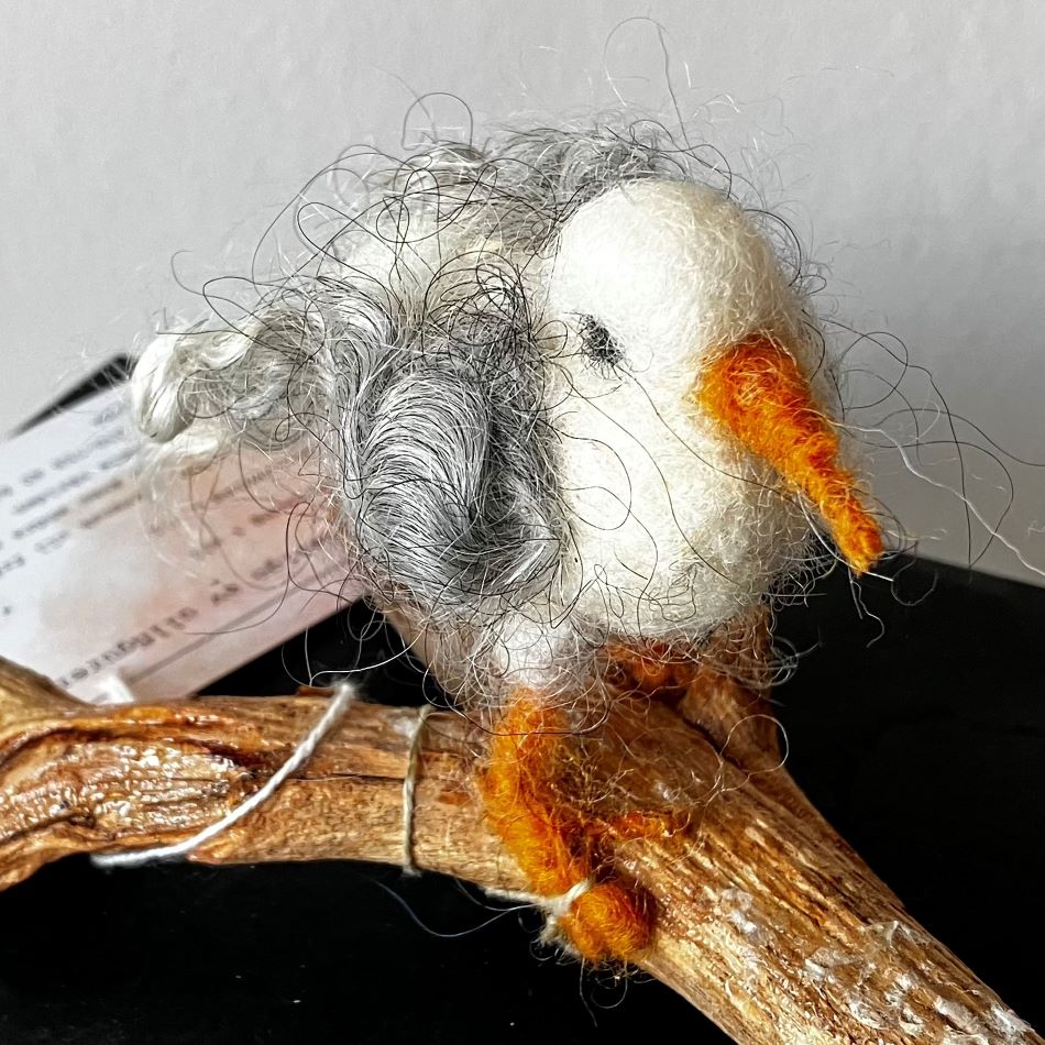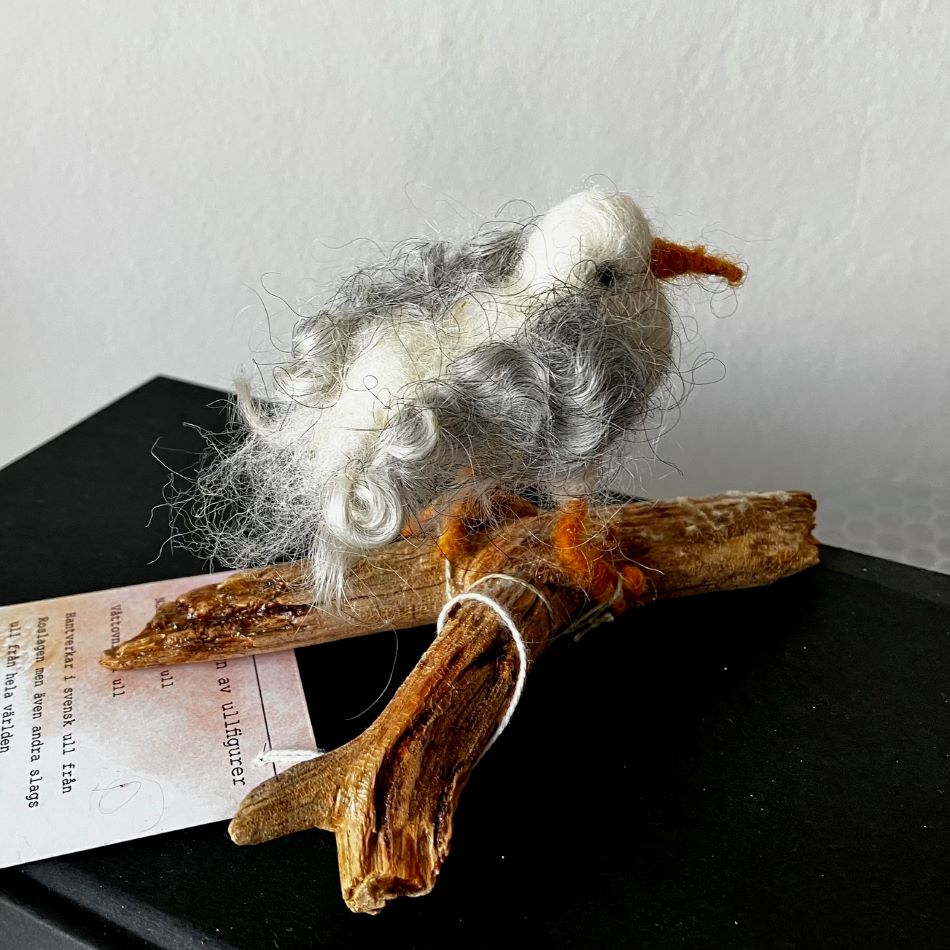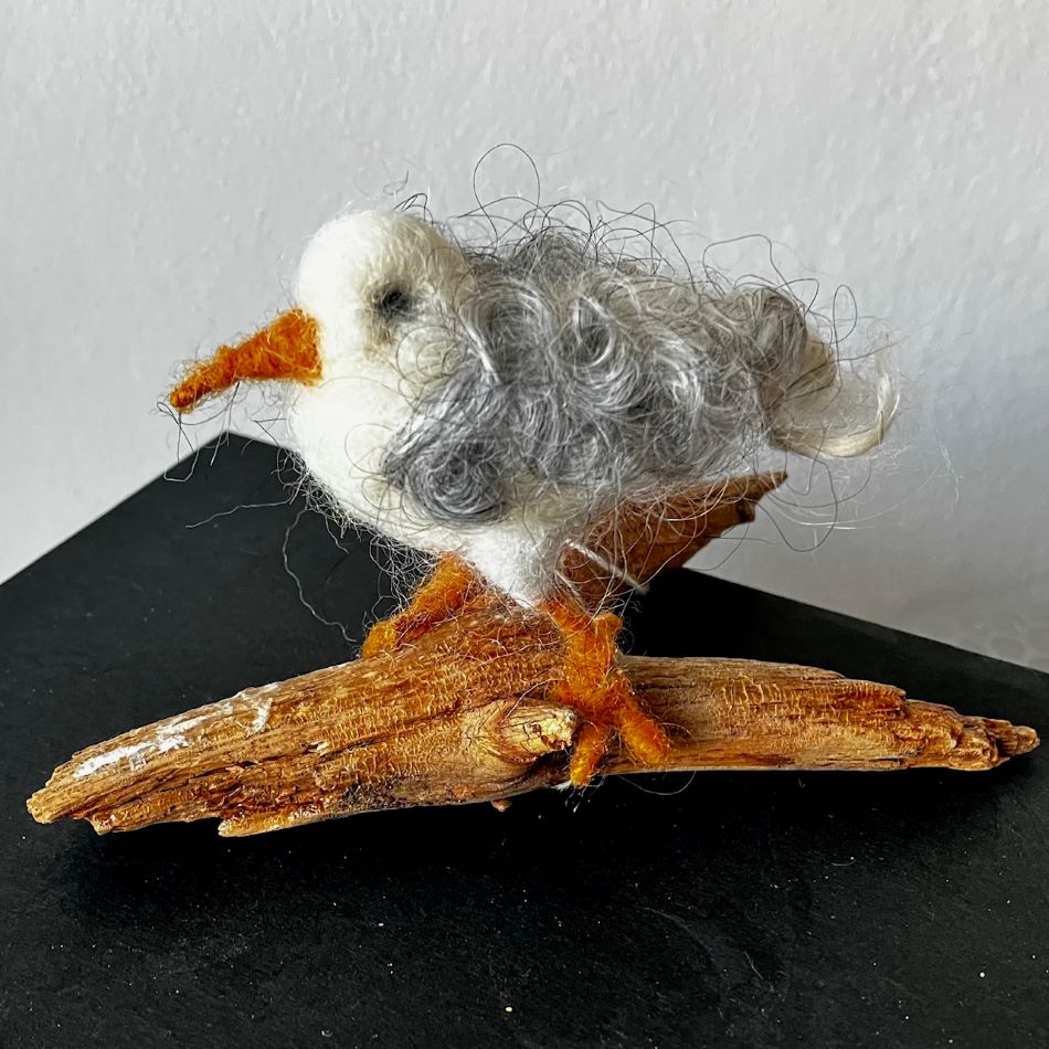Liten rolig mås skapad av svensk ull. Stående på en pinne, Nålfiltad och lite ståltråd i ben. Måsen har lockar som vingar från gotlandsfår. Väger 25 gram och är cirka 8 cm hög och 13 cm lång (pinnen)
