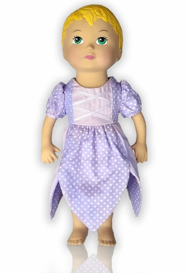 Dockans kropp är gjord av bomull och hon har en fin klänning som kan tas på och av, med kardborrknäppning baktill.