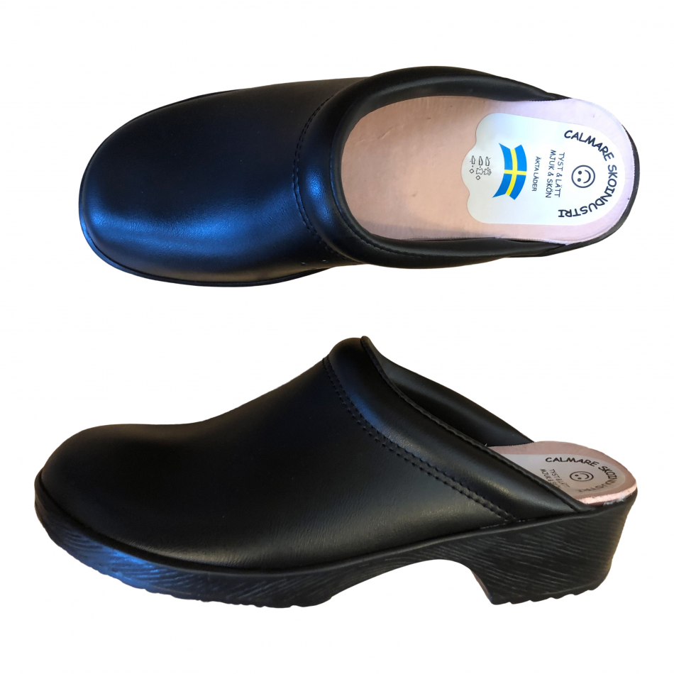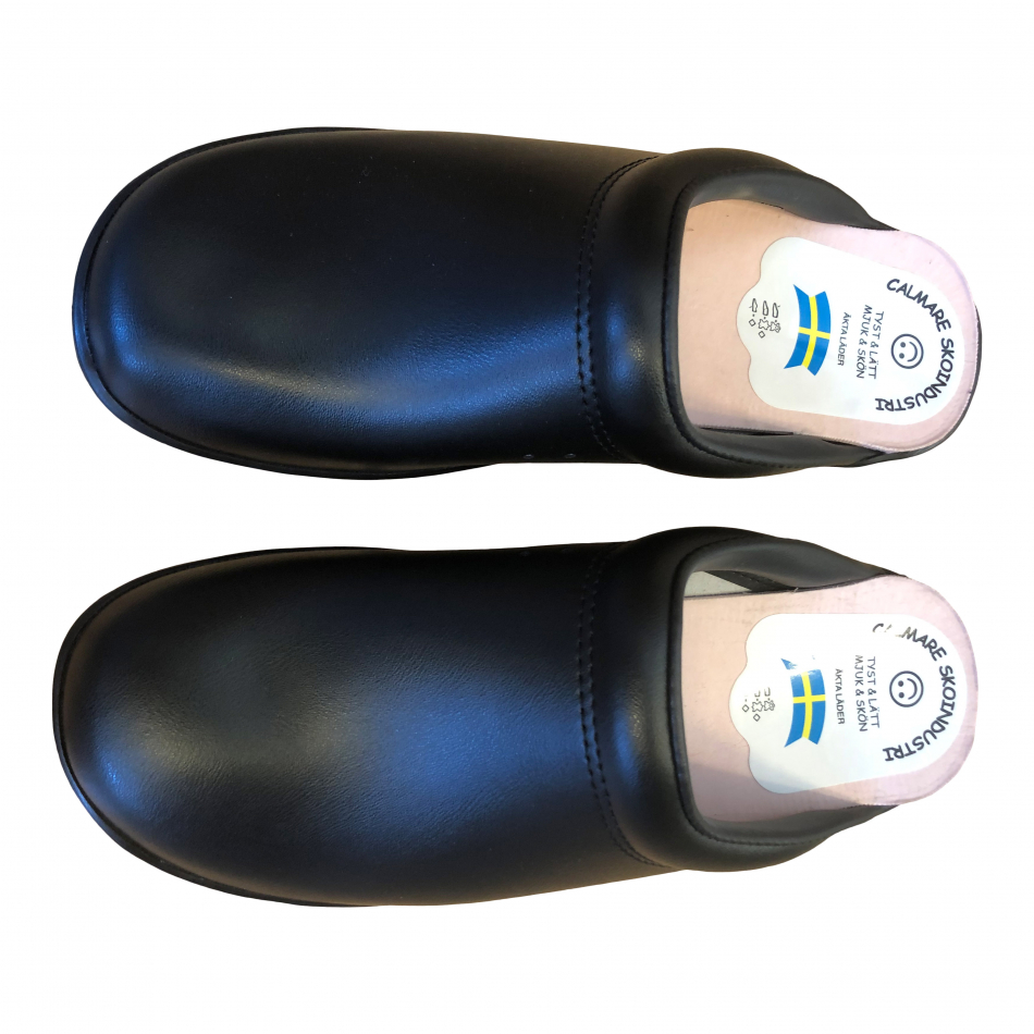 Fotvänliga och lätta mjuktofflor / "trätofflor" med gummisula med överdel i svart skinn.