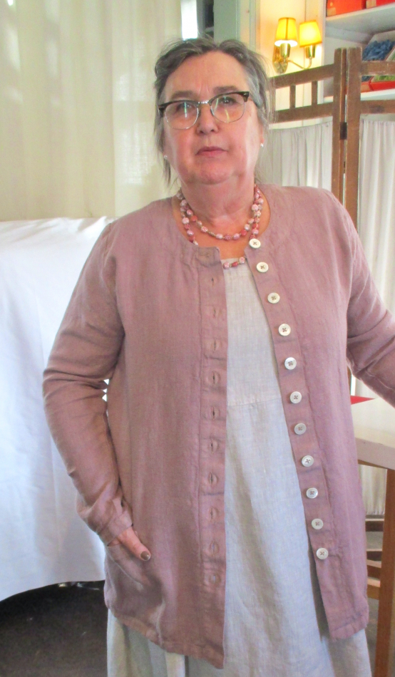 Jacka i linne med pärlemoknappar och fickor. Tvättad och handfärgad.