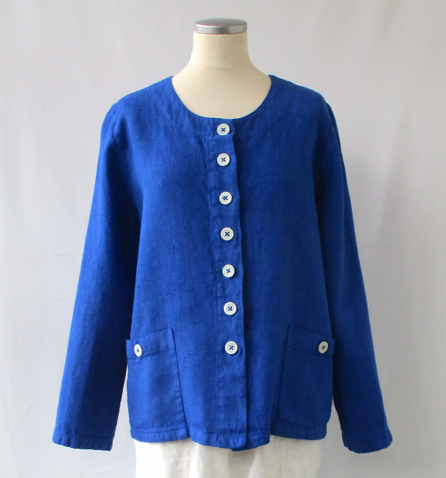 Jacka i linne med pärlemoknappar och fickor. Tvättad och handfärgad.