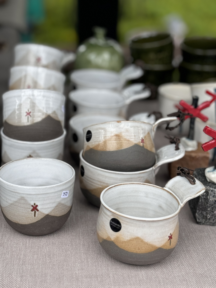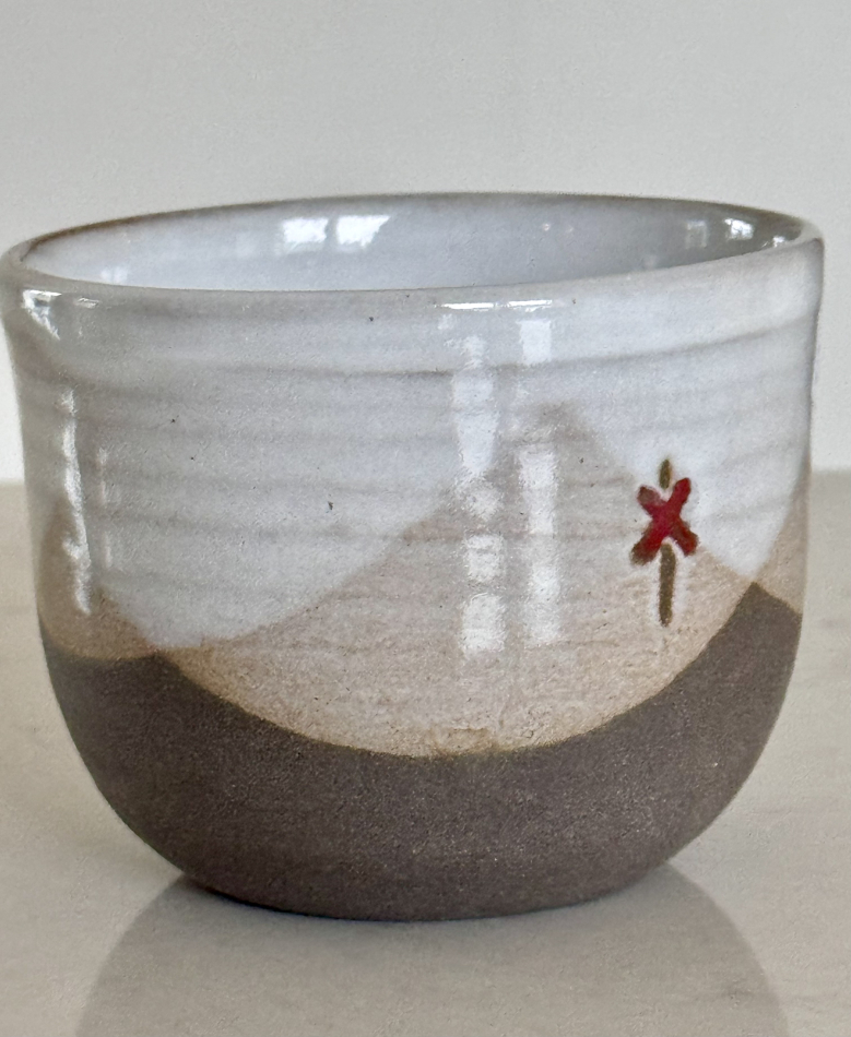 Mugg i keramik med fjällmotiv och ledkryss.