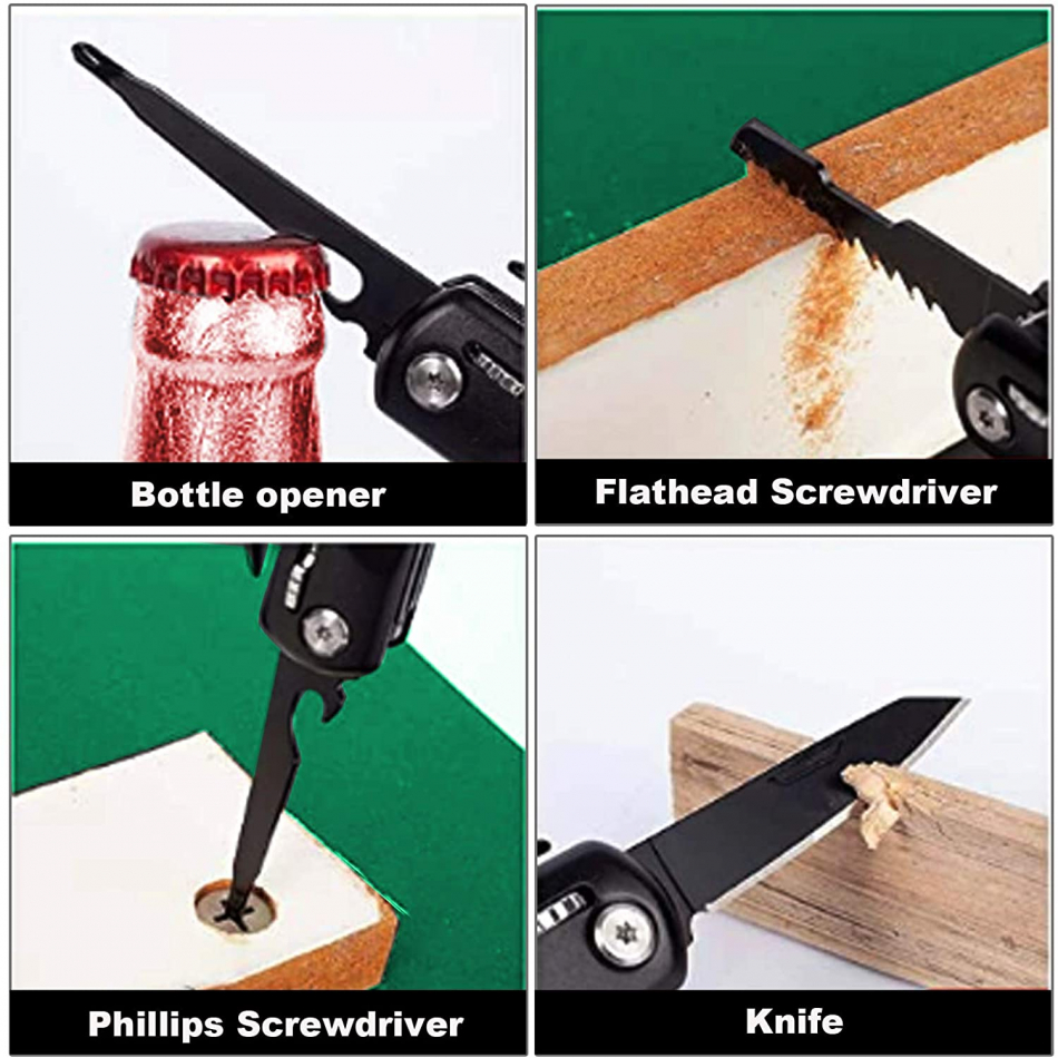 En rad viktiga verktyg inkluderar Mini Hammare-Multihammare, Tång, Wire Cutter, Kniv, Saw, Serrated Knife, Fil, Plathead Skruvmejsel, Flasköppnare mm. Med detta multifunktion verktyg har du all slags utrustning till hands i ett praktiskt verktyg.