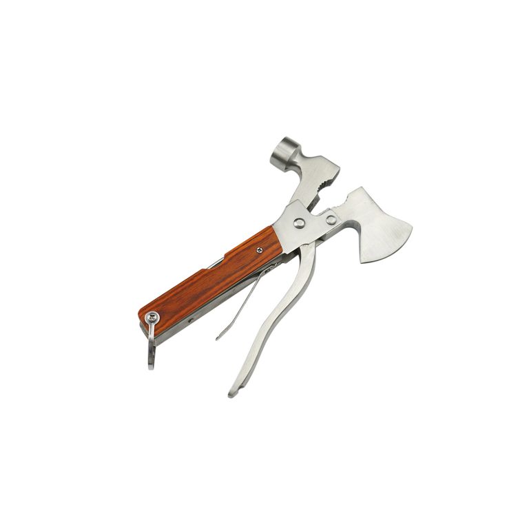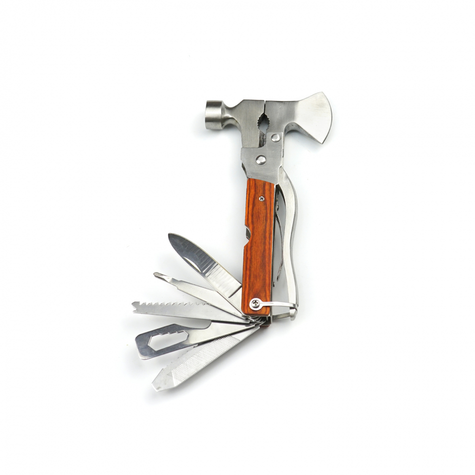 Har yxa, hammare, kniv, såg, flera blad.Mapp, tång, trådkapare, burköppnare och skiftnyckel