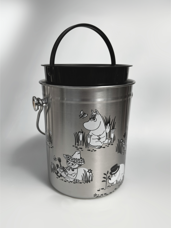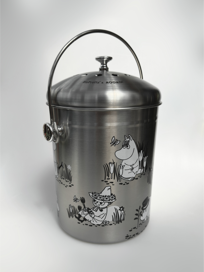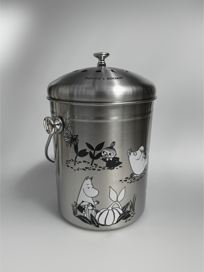 Mumins matuppsamlingshink i färgen Stainless Steel "Garden Life" finns i begränsat antal.