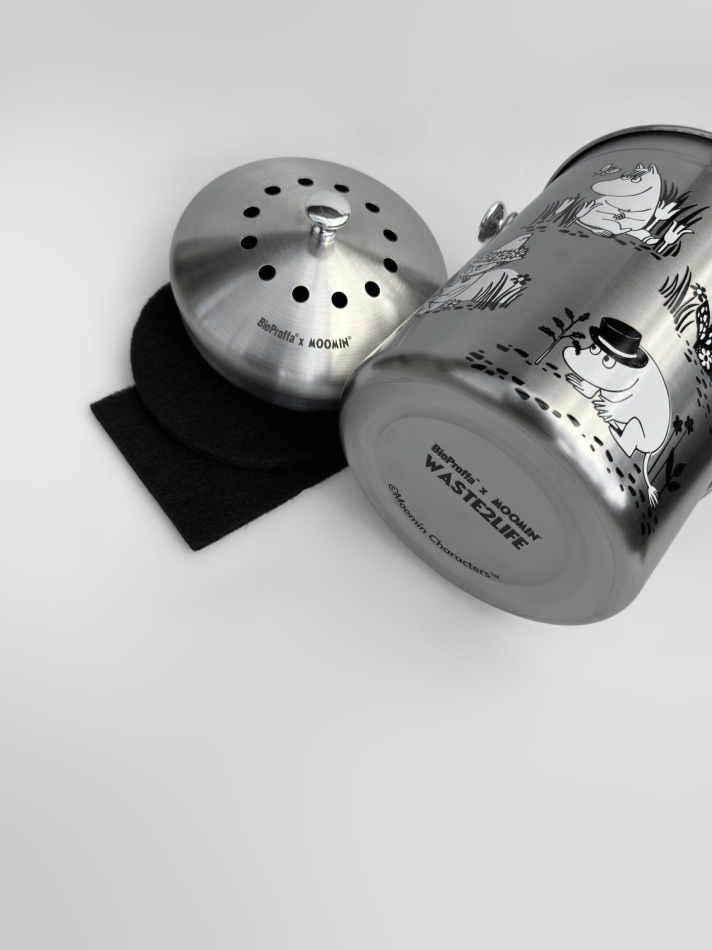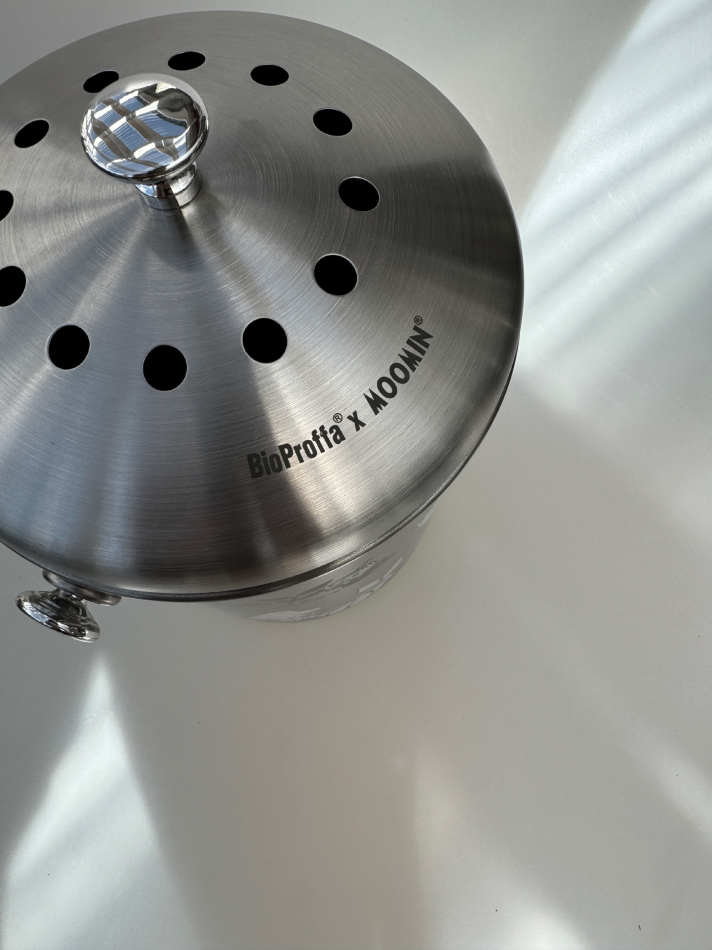 Mumins hink för matuppsamling blir en otroligt vacker inredningsdetalj i ditt kök. Det är tillverkad av rostfritt stål, har en innerhink med praktiskt handtag som går bra att diska i maskin. Locket är tätt mot fruktfrugor och har två kolfilter som förhindrar dålig lukt.