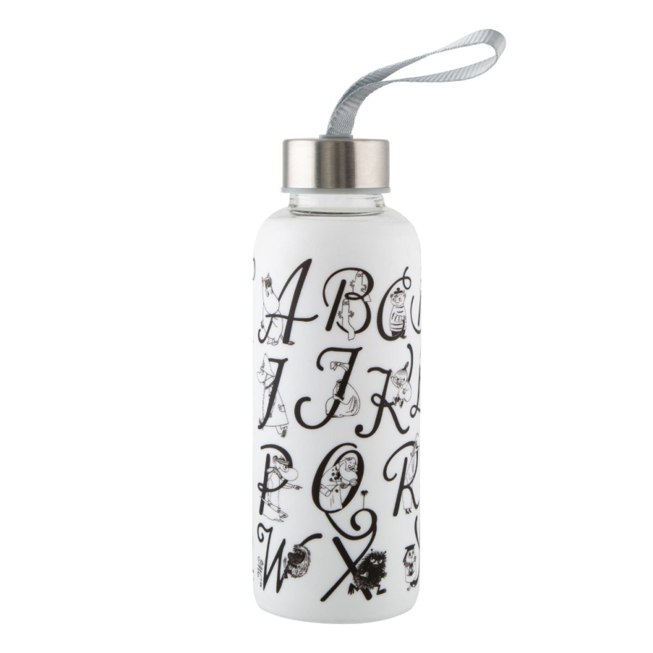 Glasflaska med silikonskydd. Skyddet dekoreras av ett Mumin ABC-motiv. Vattentät skruvkork med silikontätning och ögla i korken.