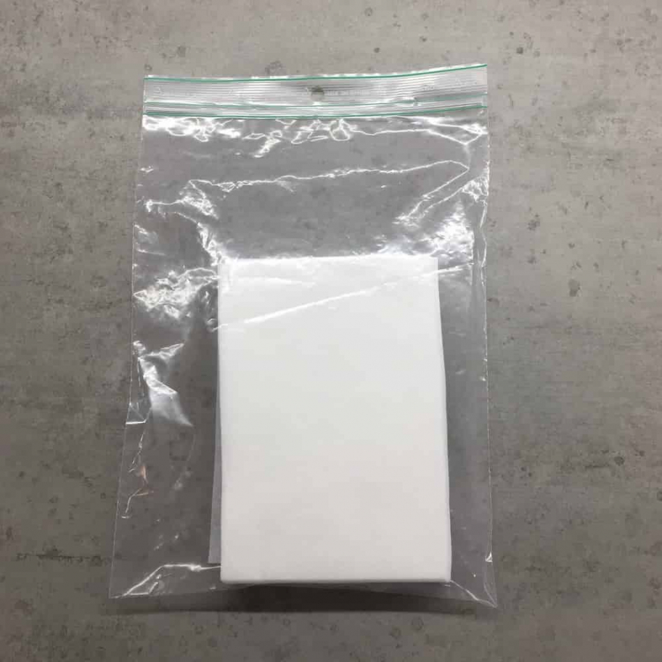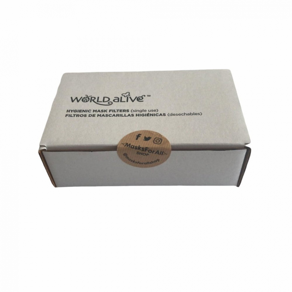 Förpackning med 100 filterark till våra flergångsmunskydd av antimikrobiell ekologisk bomull.
